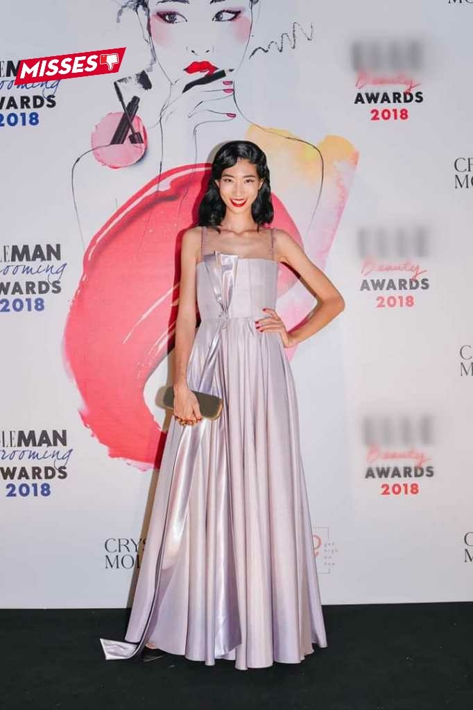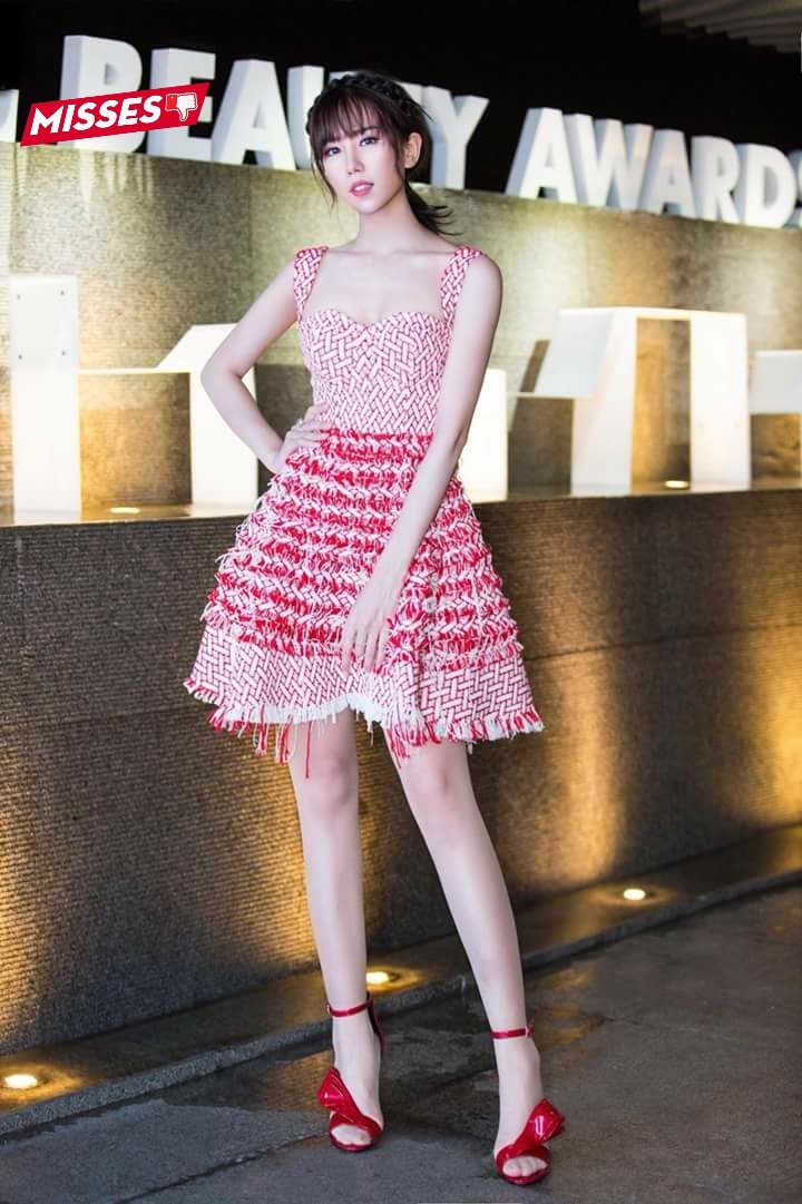 Bình thường thì ăn mặc rất cá tính, thế nhưng không hiểu sao, khi tham dự sự kiện, Chà Mi lại chưng diện bộ cánh có phần lỗi mốt này. Chiếc áo sequin trễ vai phom rộng khiến người đẹp mất hết đường cong, kết hợp cùng chân váy chất liệu da bóng khiến tổng thể rối mắt.