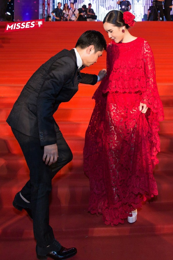 Thậm chí, để bước lên bục thảm đỏ, phần váy dài quá vướng víu khiến Lưu Hương Giang còn phải cậy nhờ phu quân của mình - nhạc sĩ Hồ Hoài Anh giúp sức. Ngoài ra, bông hoa đỏ cài tóc cũng phần nào khiến cô trở nên sến sẩm.