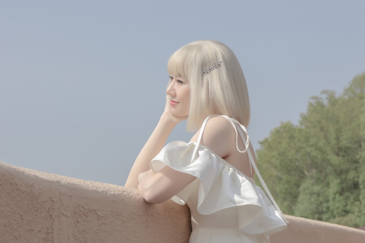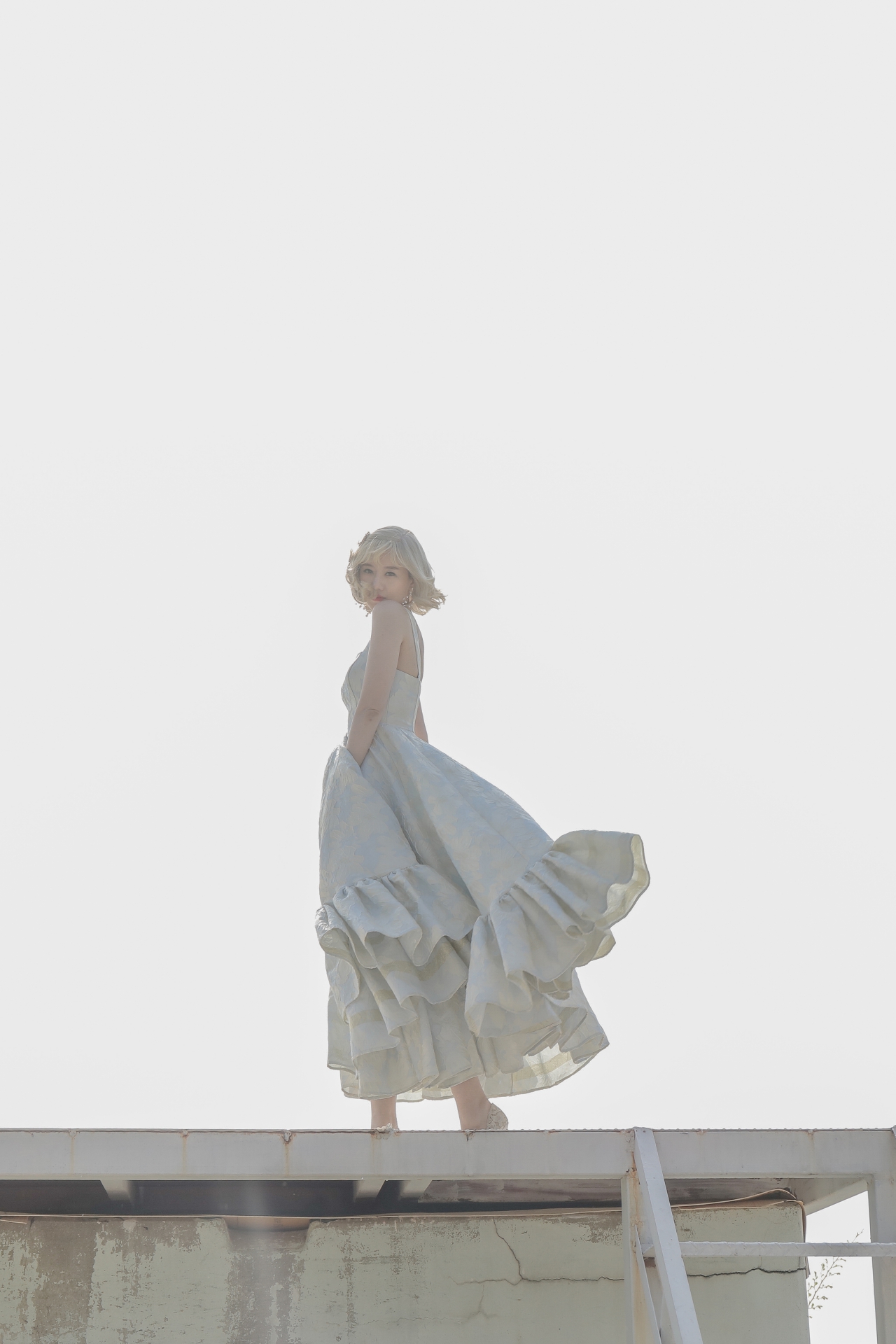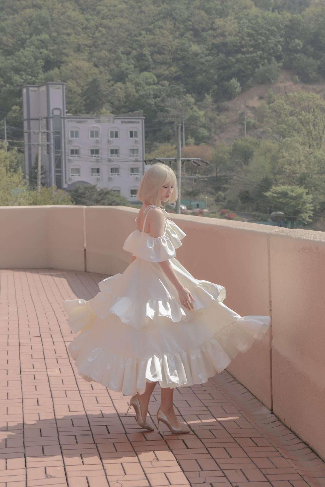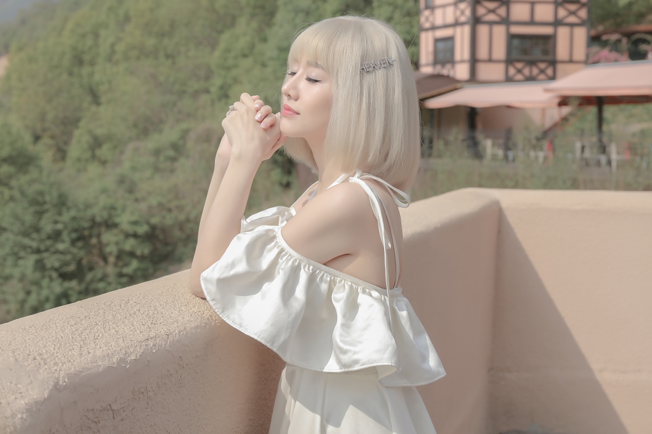 Hari Won diện thiết kế trễ vai nhấn nhá bởi phần bèo nhún ở ngực kéo dài đến thân váy. Với tổng thể trắng từ trang phục tới phụ kiện, bà xã Trấn Thành khiến nhiều người liên tưởng đến hình ảnh một nàng búp bê trong truyện cổ tích. Đặc biệt, cô gây chú ý biến tấu với mái tóc ngắn với màu bạch kim nổi bật.