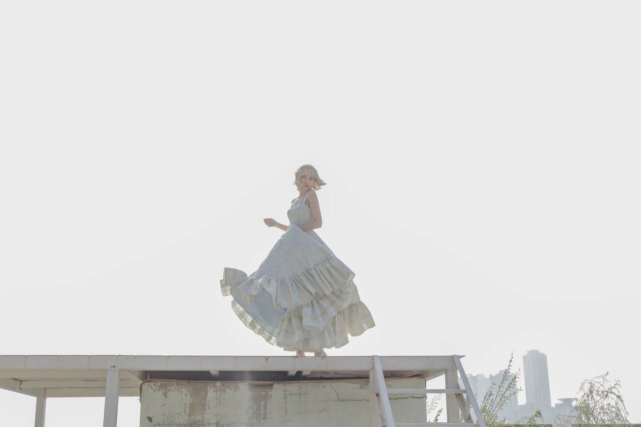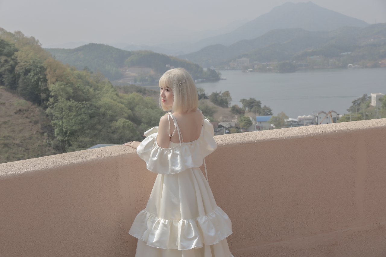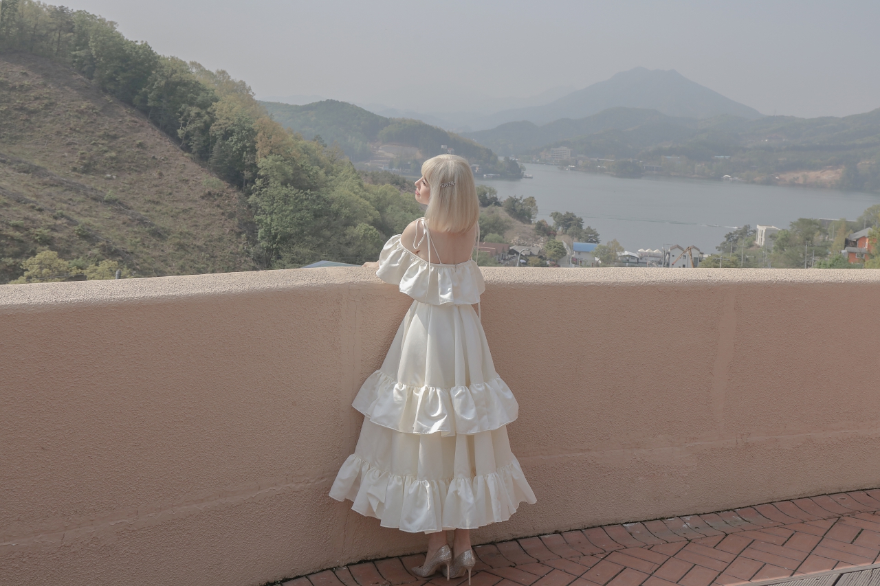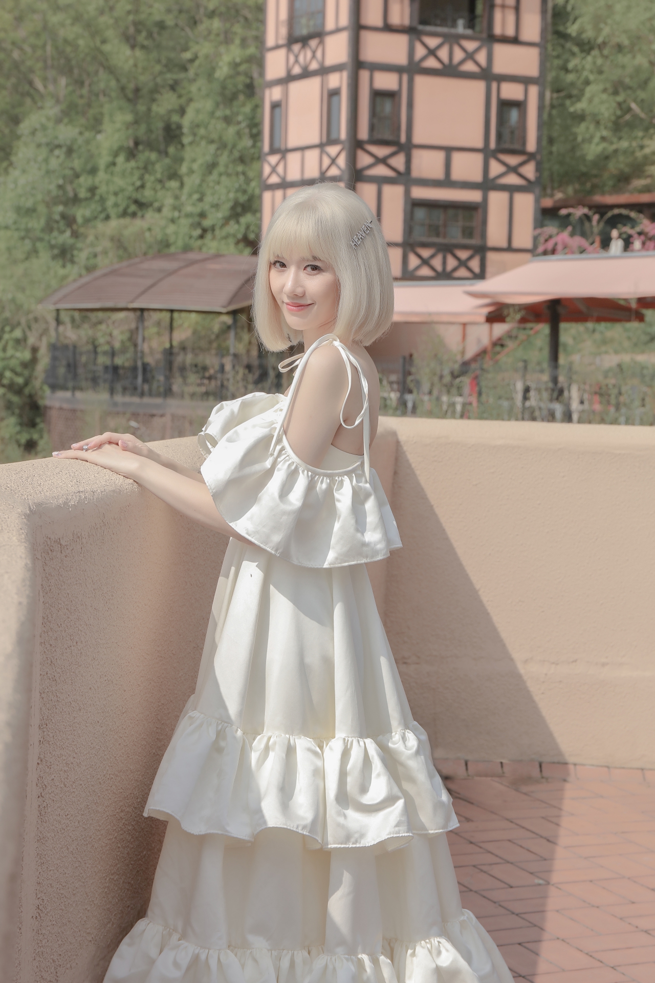 Hari Won diện thiết kế trễ vai nhấn nhá bởi phần bèo nhún ở ngực kéo dài đến thân váy. Với tổng thể trắng từ trang phục tới phụ kiện, bà xã Trấn Thành khiến nhiều người liên tưởng đến hình ảnh một nàng búp bê trong truyện cổ tích. Đặc biệt, cô gây chú ý biến tấu với mái tóc ngắn với màu bạch kim nổi bật.