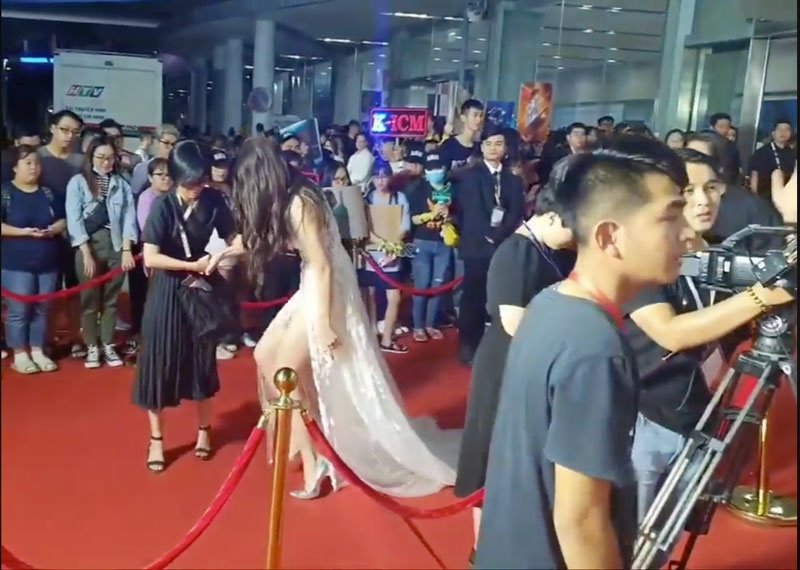 Cụ thể khi hoàn tất xong khâu chụp ảnh trên thảm đỏ, người đẹp di chuyển về hướng sân khấu để ổn định chỗ ngồi. Bất ngờ thay cô đã té ngã vì đế của đôi giày vô tình dặm phải chân váy. Rất may cú ngã không quá nghiêm trọng cộng với sự trợ giúp từ đội ngũ nhân viên túc trực thảm đỏ nên cô đã lấy lại được bình tĩnh và tiếp tục di chuyển vào phía trong sân khấu.