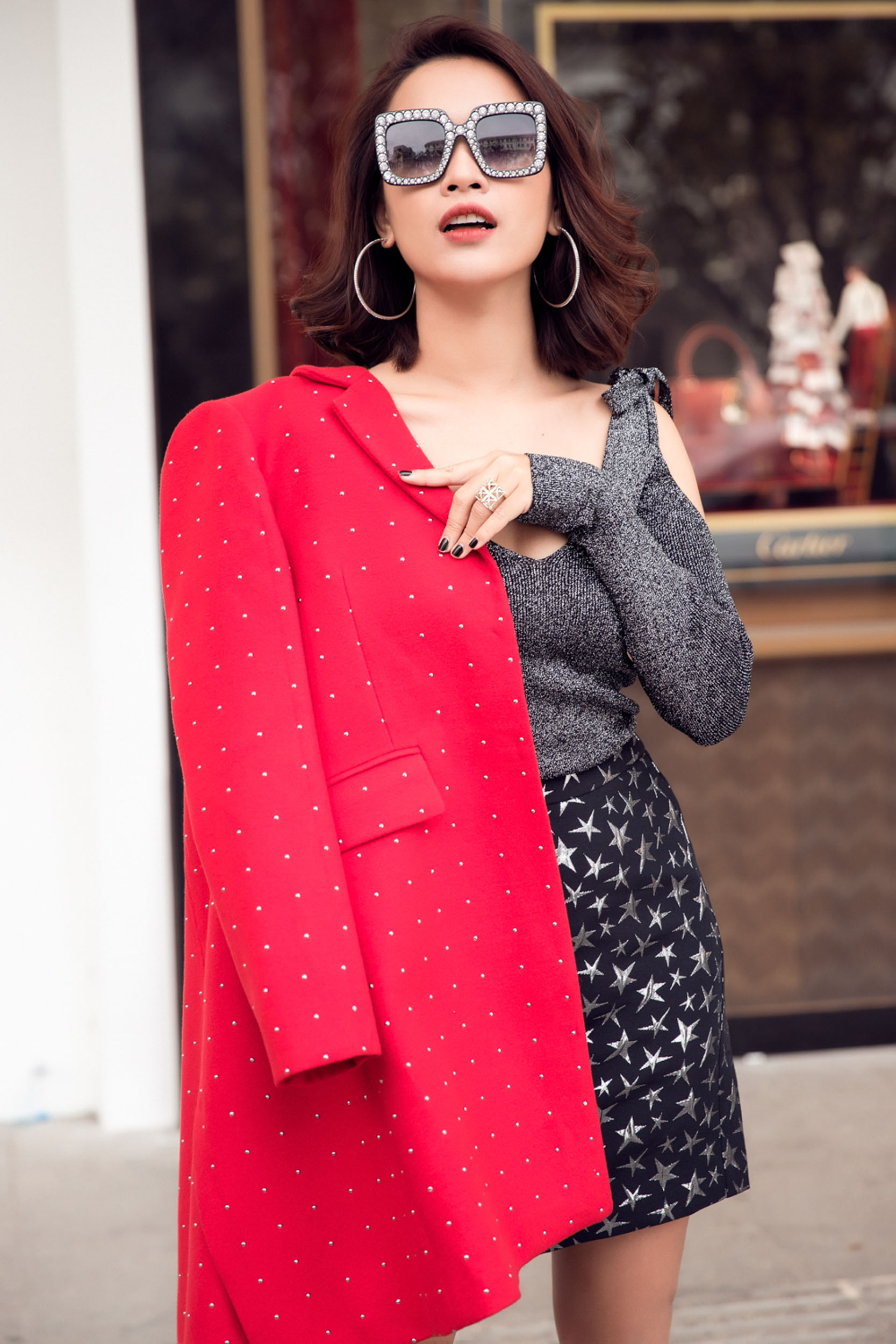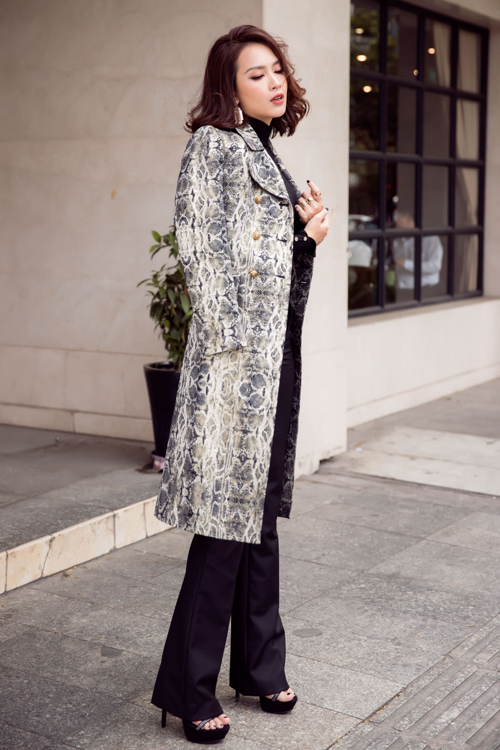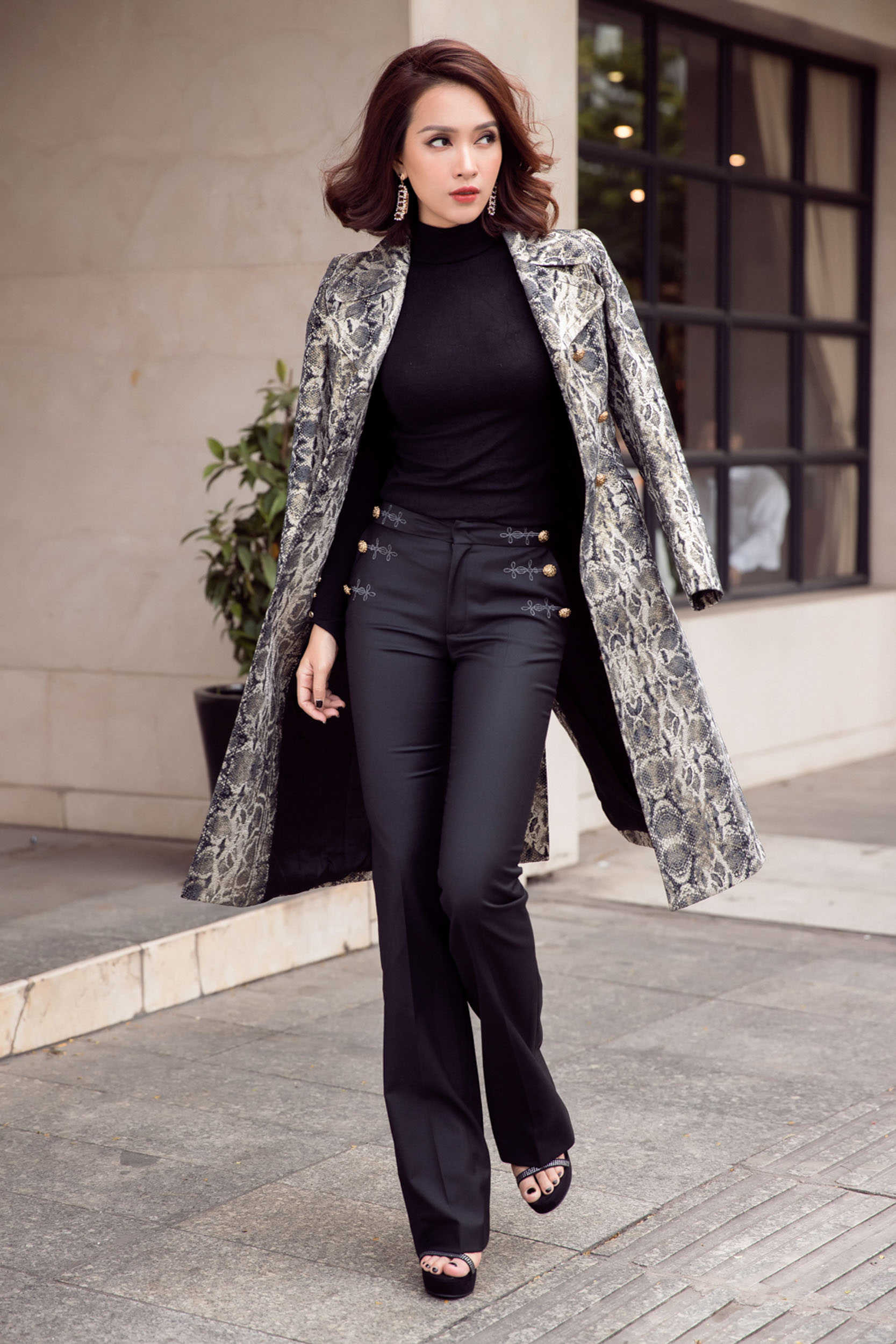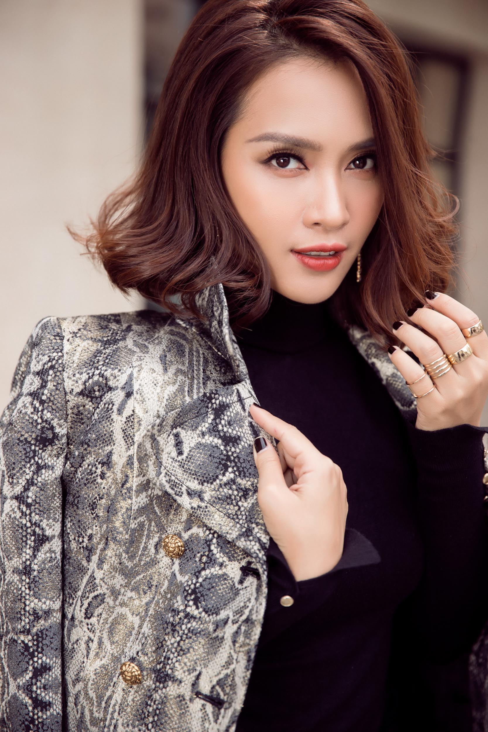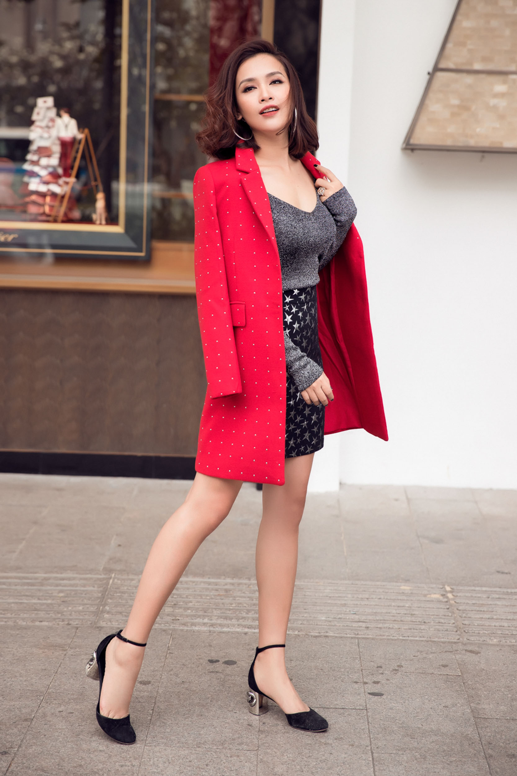 Nữ ca sĩ xuất hiện với những chiếc đầm ôm tôn dáng, kết hợp cùng các kiểu áo khoác vai thanh lịch cùng mái tóc uốn xoăn quý phái.