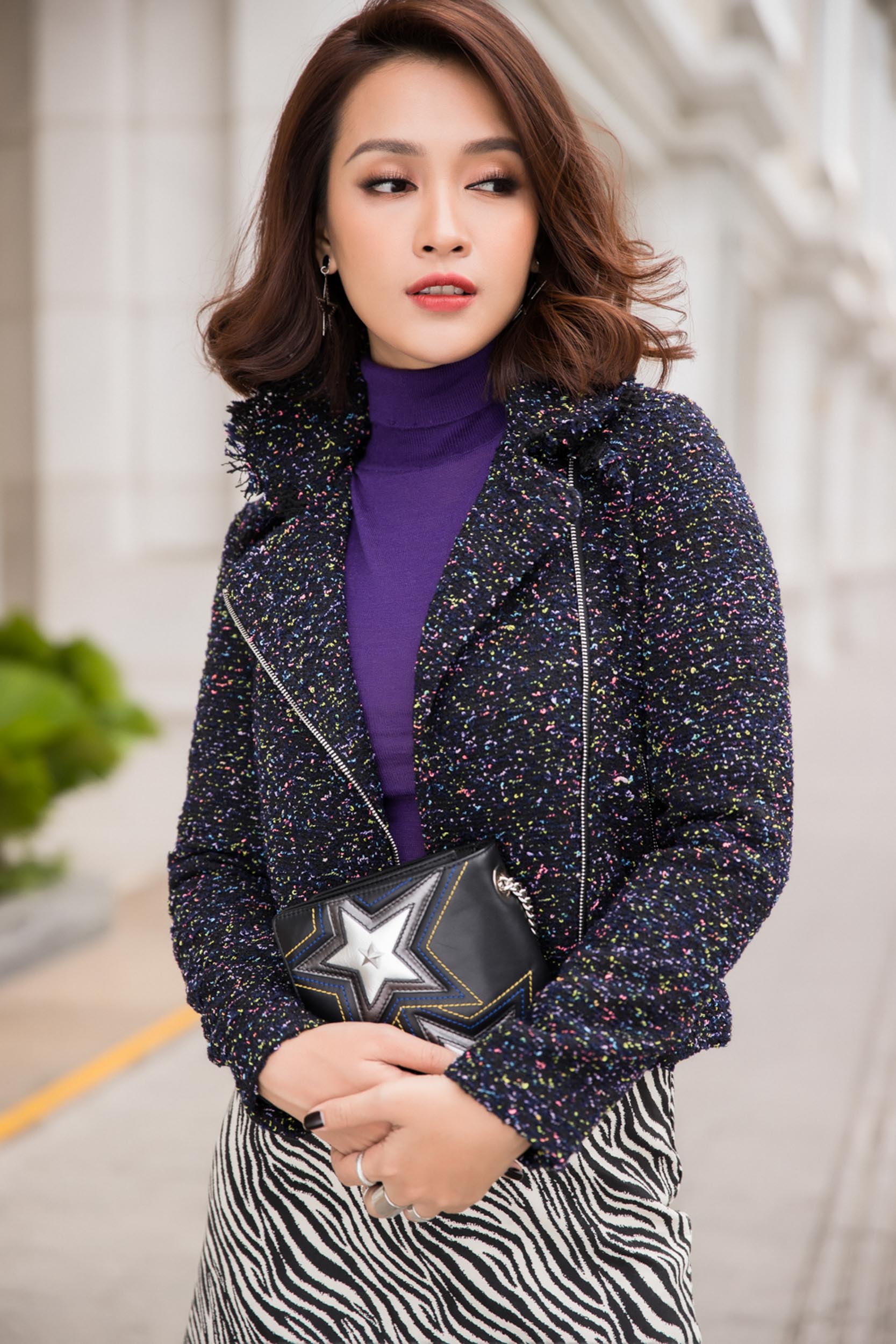 Ái Phương lại thể hiện “cái tôi” thời trang của mình với trang phục họa tiết lạ mắt. Mang những nét chấm phá, chi tiết đậm chất tự do, là nguồn cảm hứng kích thích thị giác và trí tưởng tượng cho người đối diện.