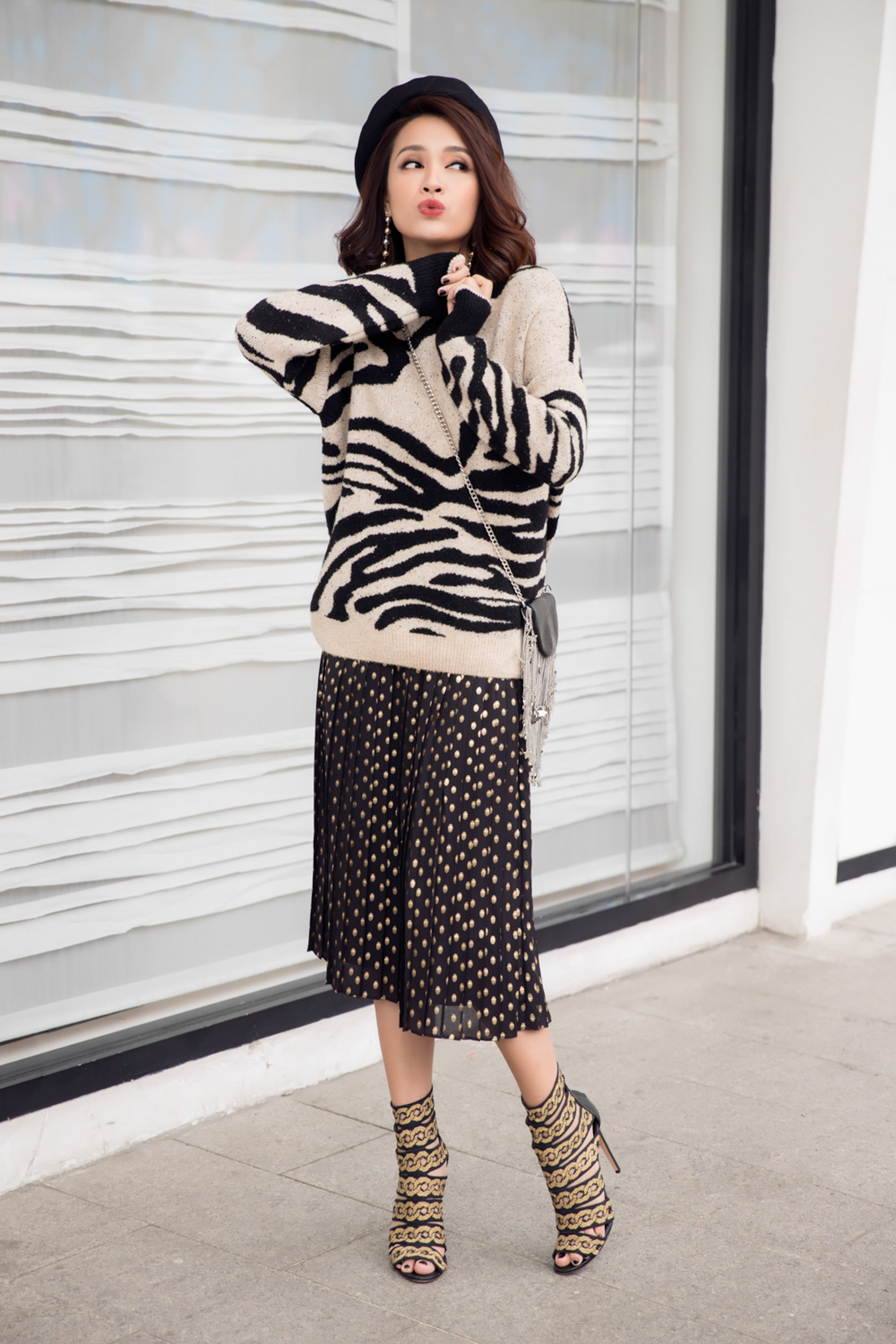 Ngoài ra, cô ưu ái kết hợp cùng phụ kiện nón và mắt kính để toát lên thần thái lôi cuốn. Trong một vài bức ảnh khác, nữ ca sĩ kết hợp quần ống suông hoặc chân váy để khéo léo khoe được đôi chân dài miên man.