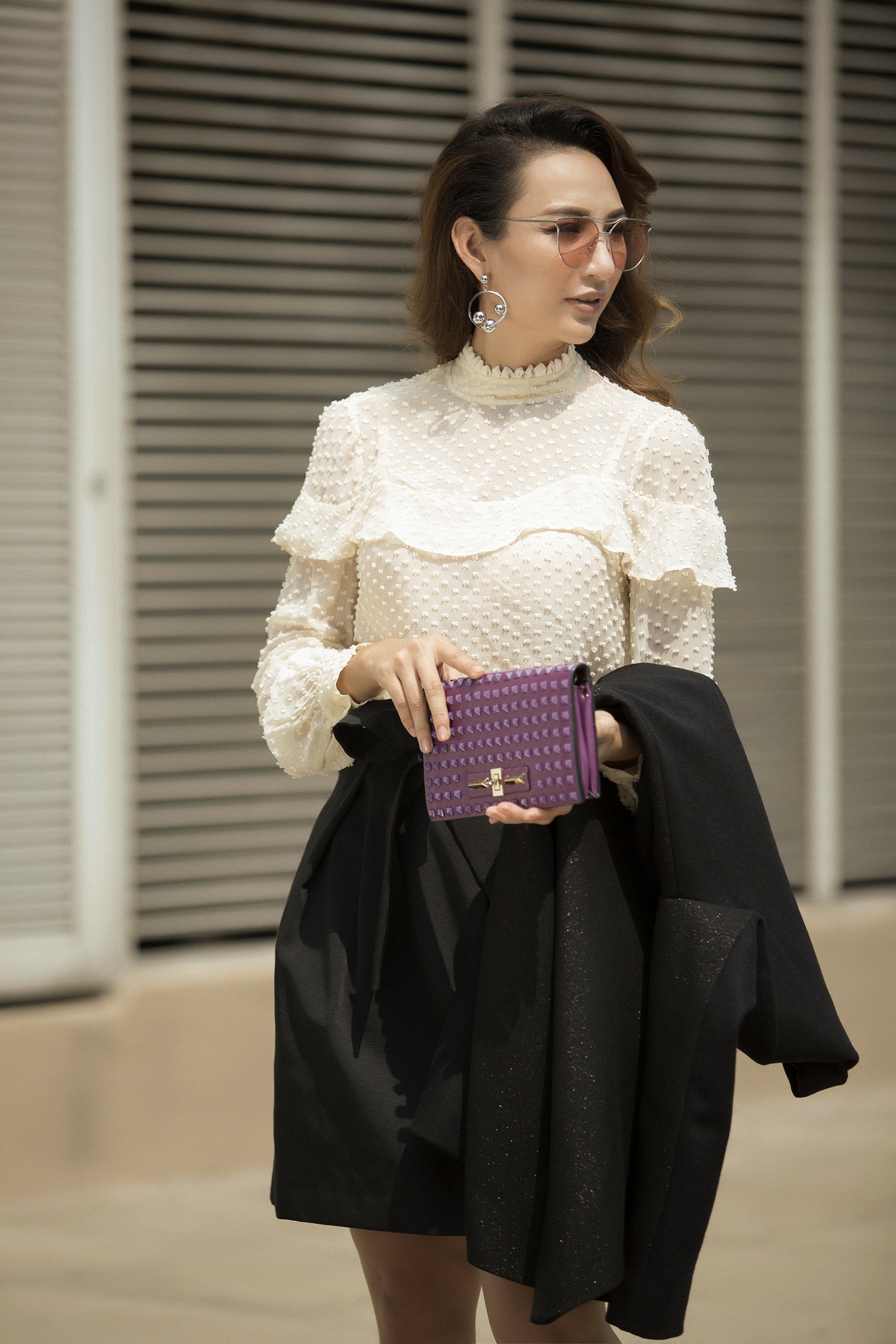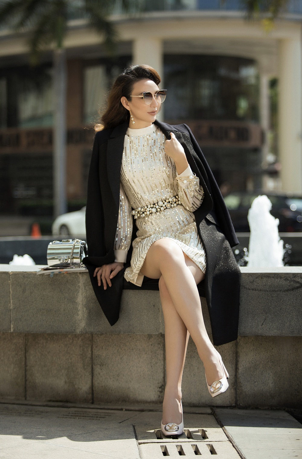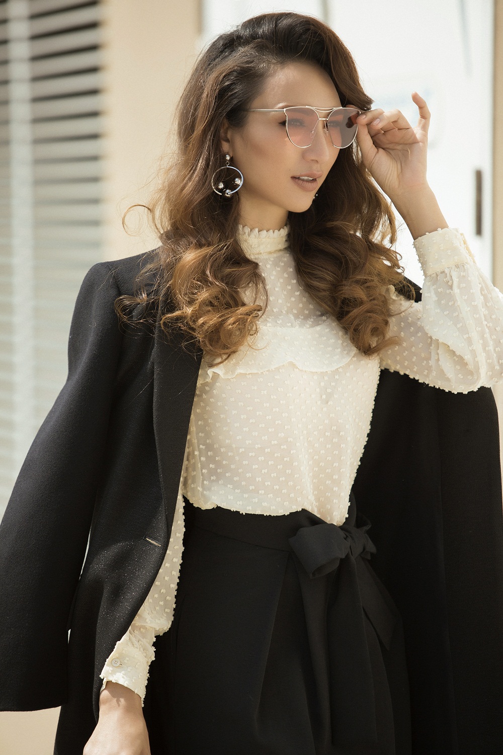 Ngọc Diễm cho thấy sự cập nhật xu hướng khi kết hợp với váy trắng phía trong và áo khoác ngoài tạo nên hình ảnh sang trọng của một cô nàng thành thị. Điểm nhấn của set đồ này là chi tiết đai thắt lưng kèm phụ kiện túi xách, giày ton sur ton với bộ trang phục.