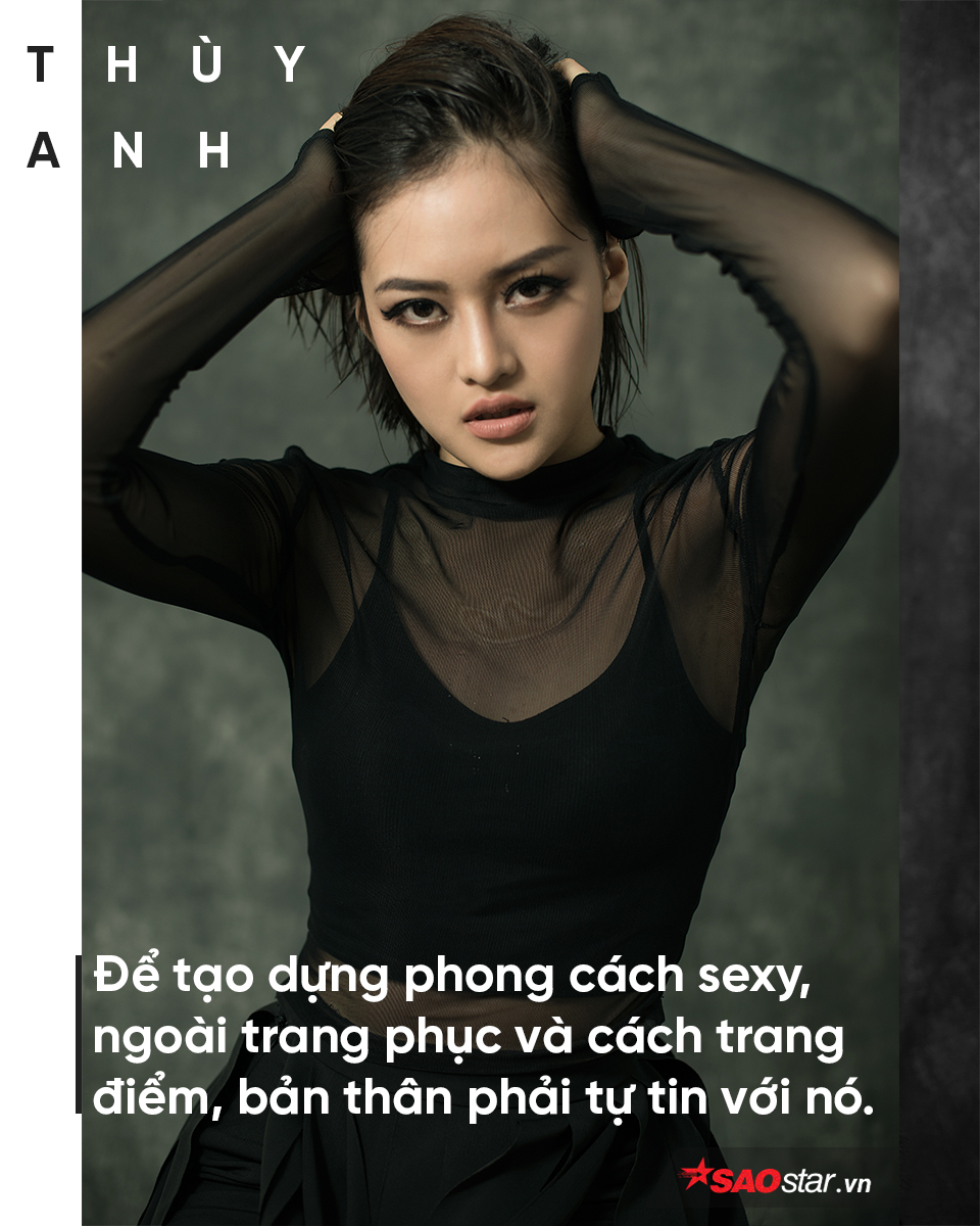 - Quan điểm cá nhân thôi, với Thùy Anh, để tạo nên hình ảnh sexy thì ngoài việc đầu tư trang phục hay cách trang điểm, còn điều gì cần lưu ý nữa?