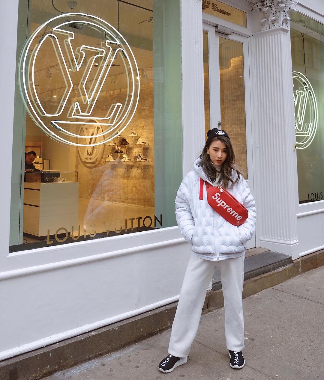 Cả cây trắng sành điệu được Quỳnh Anh Shyn nâng tầm với túi đeo chéo đỏ và đôi sneaker lạ mắt. Hai món phụ kiện đẹp đến nỗi ở phía dưới bức ảnh, Chi Pu cũng phải lên tiếng khen.