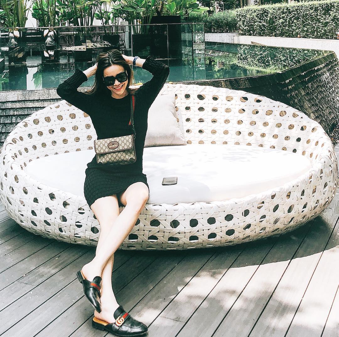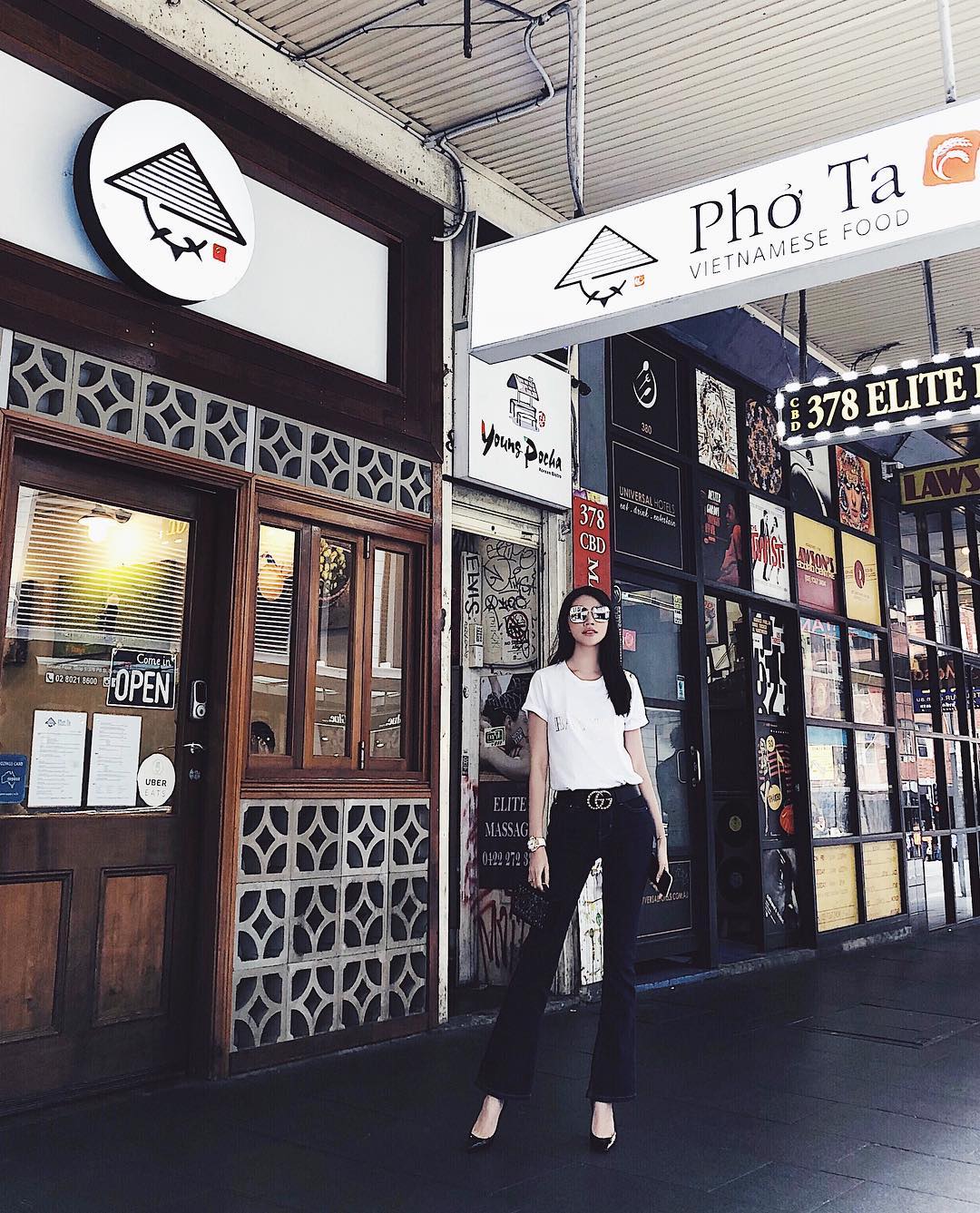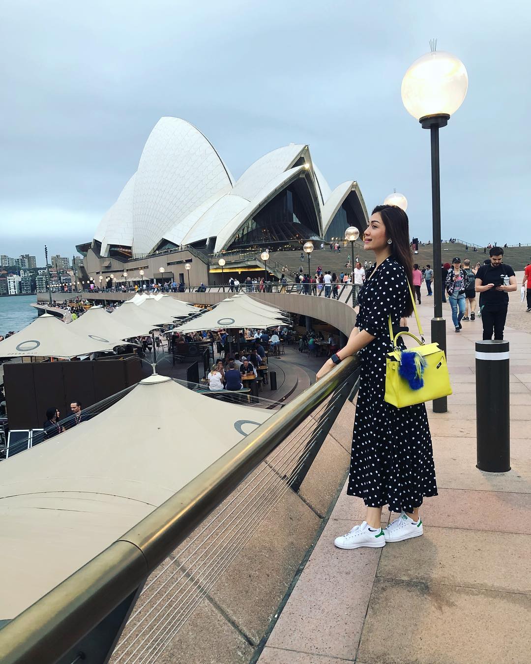 Với chiếc váy chấm bi tông màu tối, á hậu Lệ Hằng khiến cả bộ cánh trở nên sáng bừng khi phối với túi Hermes vàng và giày sneaker đế bệt. Đây là bộ cánh người đẹp chưng diện khi đang tận hưởng kì nghỉ tại Úc.
