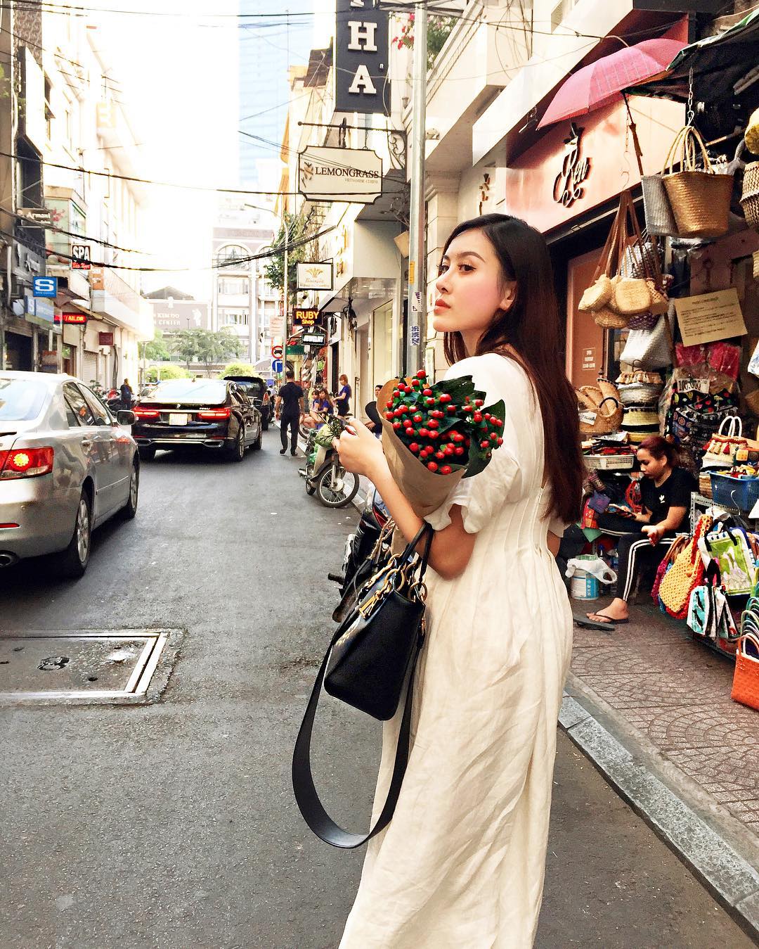 Chiếc váy trắng đơn giản là sự lựa chọn của Hà Lade khi xuống phố. Để tránh đơn điệu, nàng hot girl Hà Nội sử dụng thêm chiếc túi to dạng IT bag làm điểm nhấn.