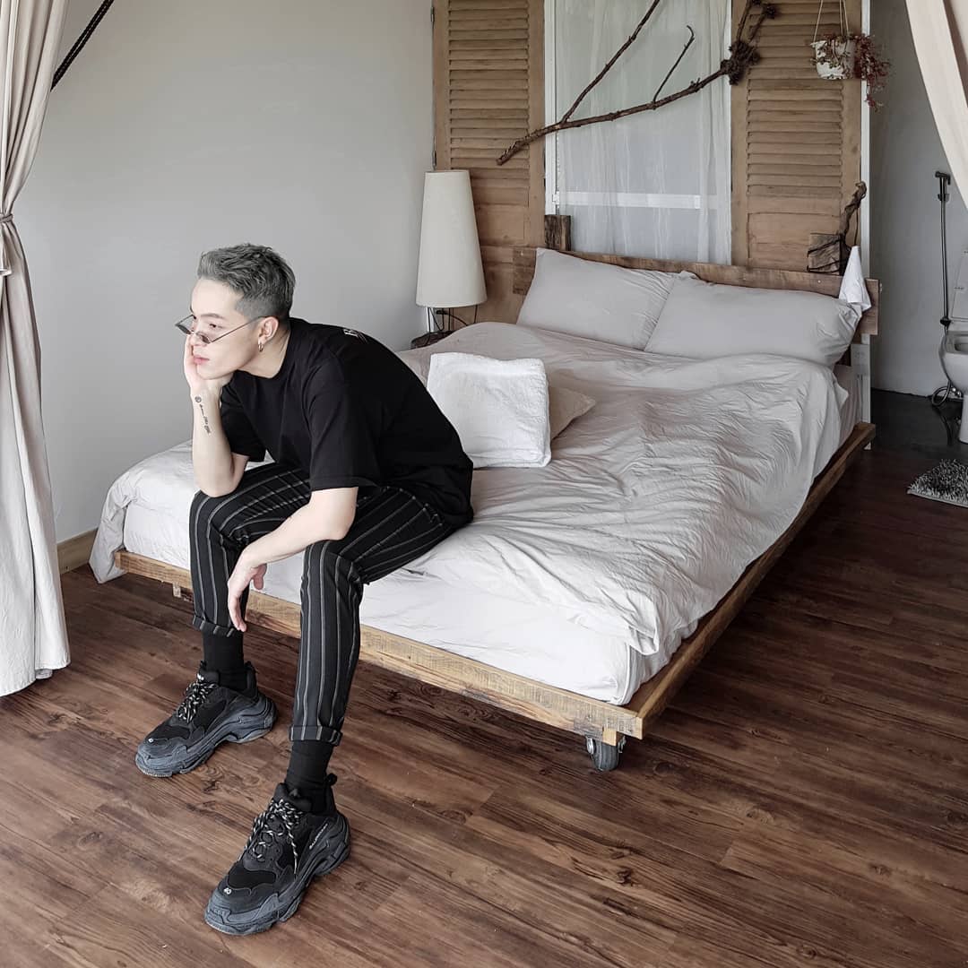 Mặc cả cây đen nhưng với cách mix, match đồ cùng quần kẻ sọc và giày Balenciaga, vẻ ngoài của Kelbin trông không hề nhàm chán mà ngược lại vô cùng chất ngất.