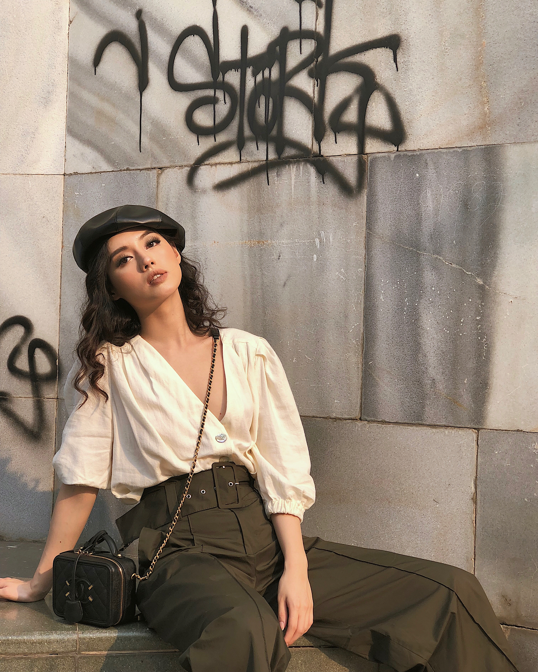 Bộ đôi áo xẻ ngực và quần ống suông cạp cao đem đến cho Khánh Linh The Face nét nhẹ nhàng, trong trẻo. Nữ hoàng lookbook Hà Nội phối thêm túi dây xích của Gucci cùng mũ nồi chất liệu da bóng nhằm tăng điểm thời thượng cho set đồ.