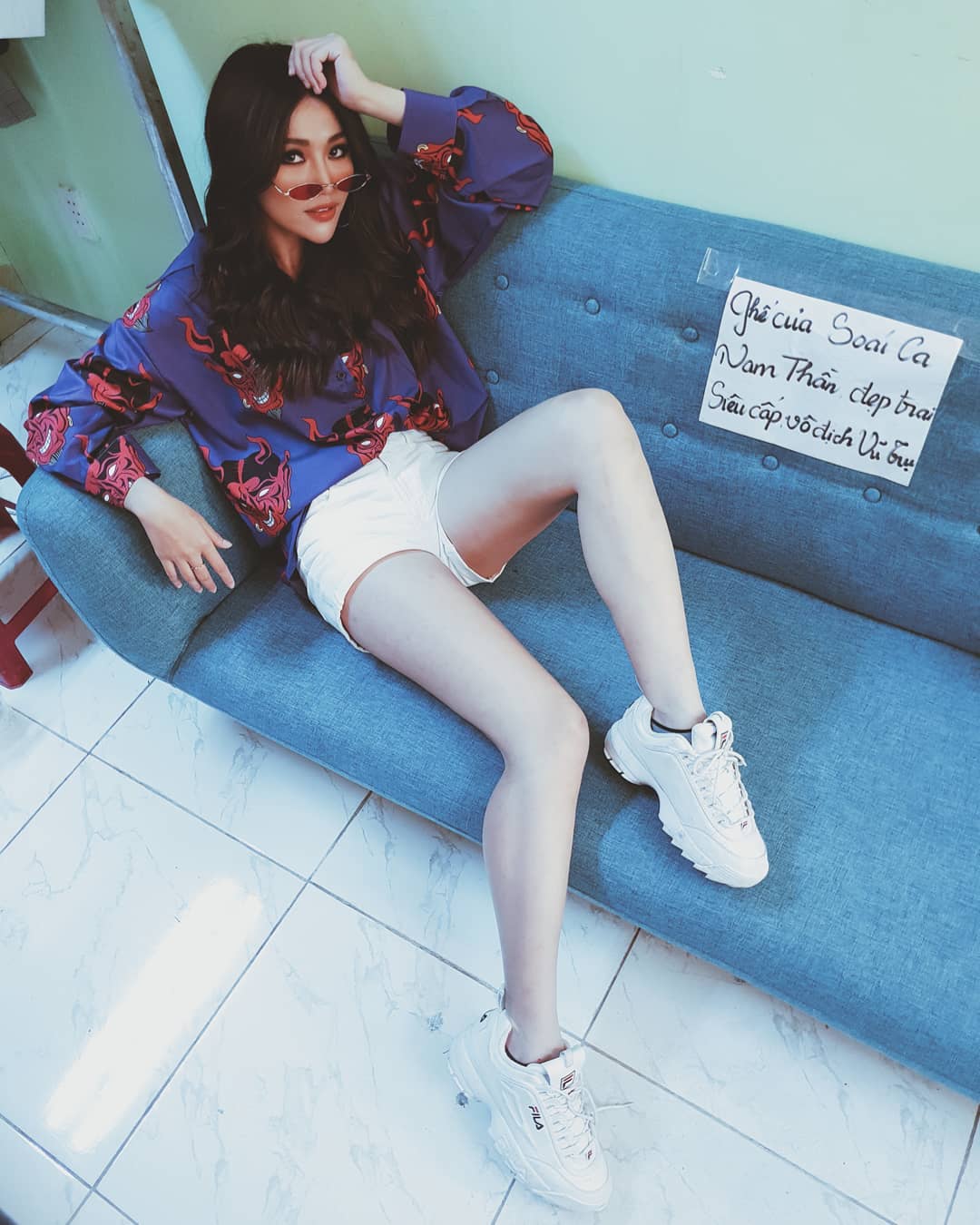 Chế Nguyễn Quỳnh Châu tự tin pose dáng với set đồ gồm áo sơ mi hoa phom rộng đi cùng quần ngắn. Dưới chân cô nàng là đôi giày Fila đắt giá, nhằm tăng điểm thời thượng.