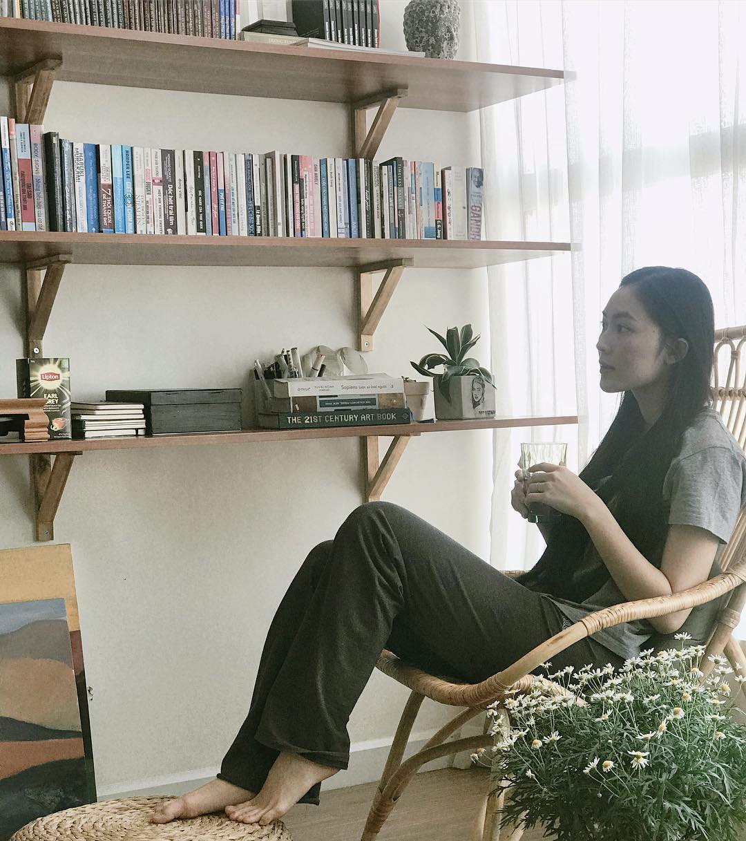 Hot girl Helly Tống nhẹ nhàng, thảnh thơi thưởng thức trà với áo phông cùng quần linen theo tông màu trầm.