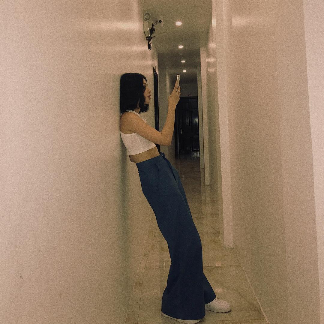 Trang phục gồm áo croptop khoe eo thon cùng quần cạp cao ống rộng là cách Tú Hảo ăn gian chiều cao khi xuống phố.