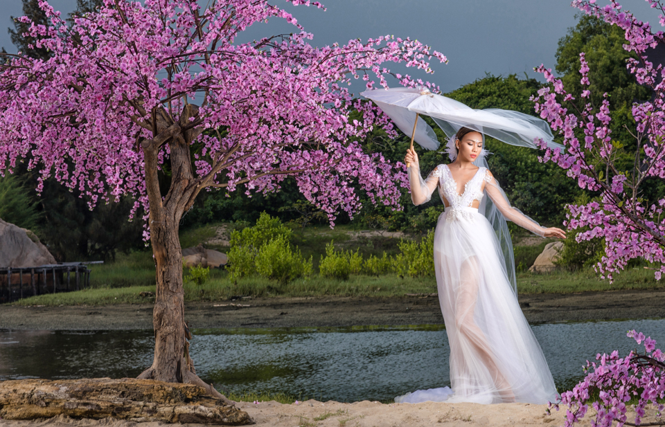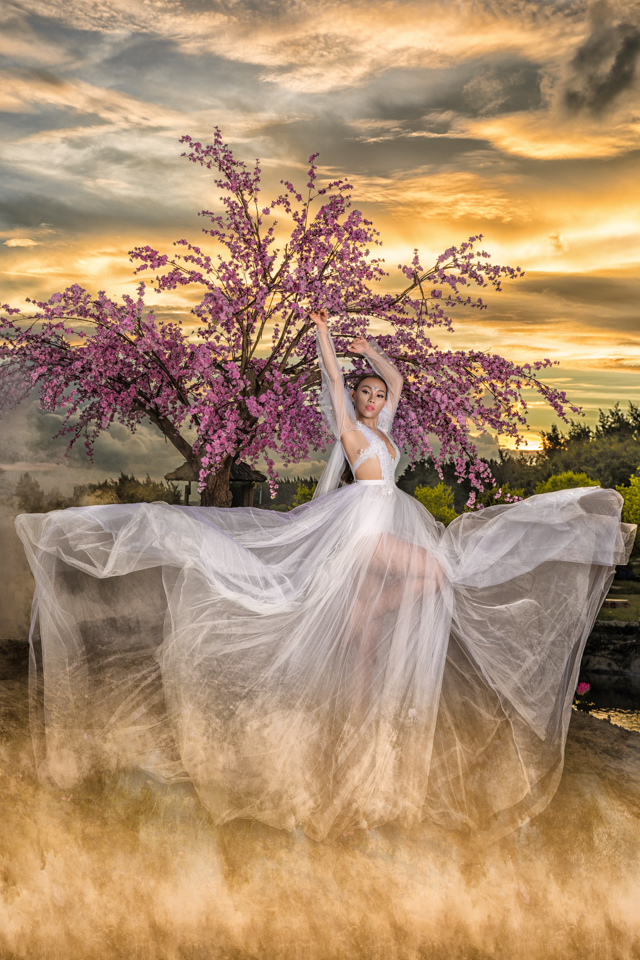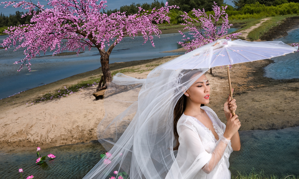 Diệu Huyền cho biết, để hoàn tất bộ ảnh cô và ê-kíp đã phải tốn rất nhiều thời gian chuẩn bị, cũng như công sức nhằm tạo nên vườn đào đẹp như tiên cảnh.