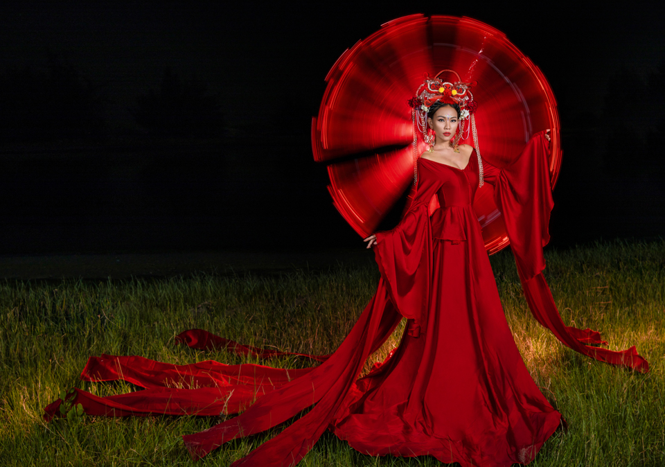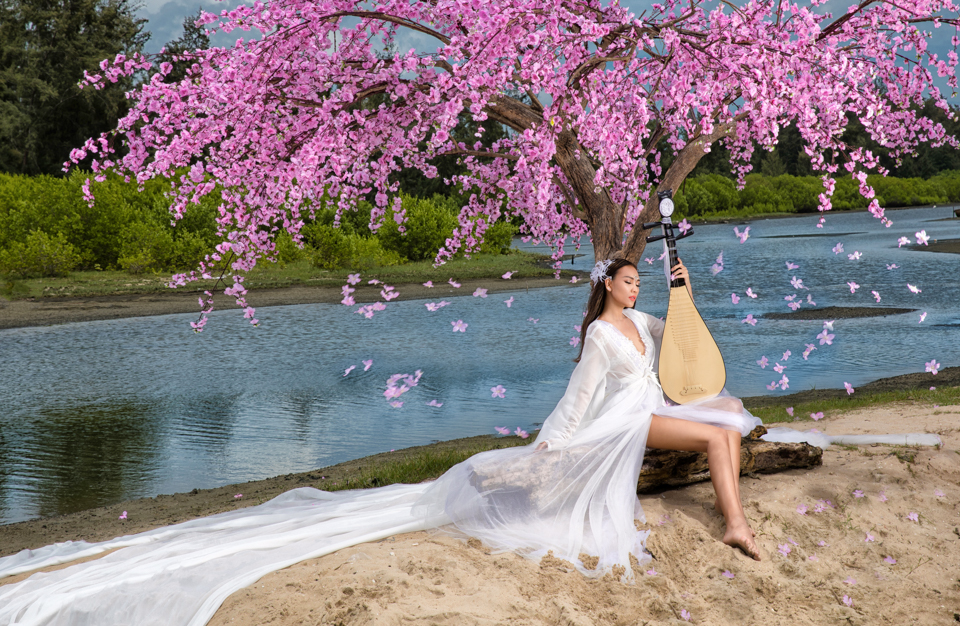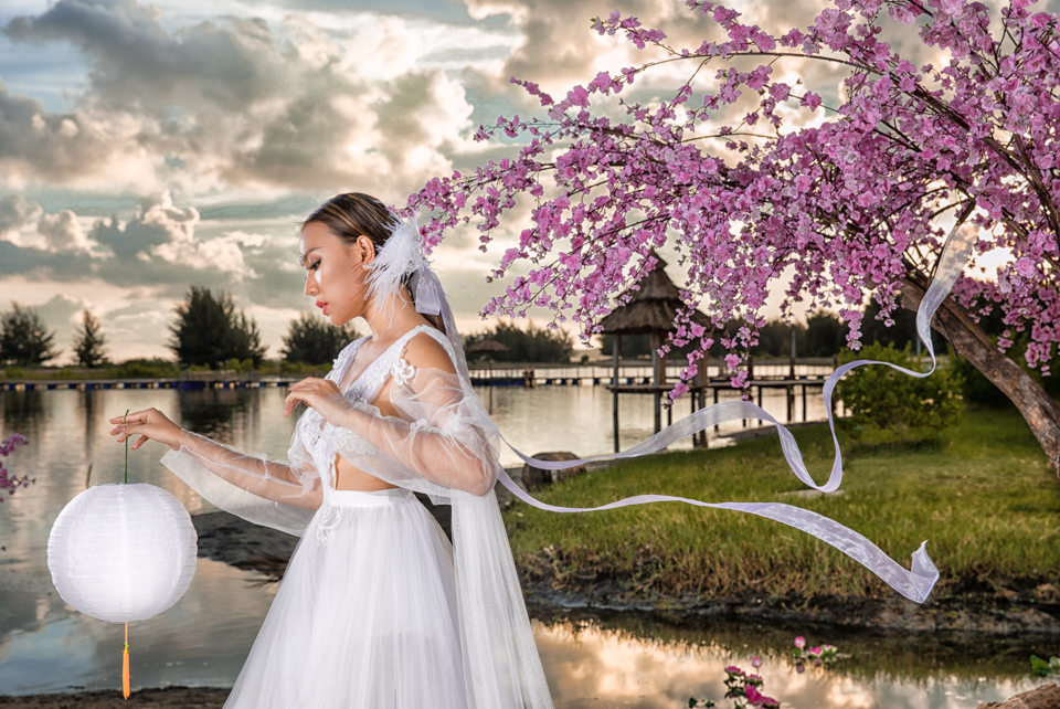 Nhằm tái hiện những ý tưởng chuyện cổ tích về chị Hằng và khơi gợi giá trị văn hoá của đêm Trung thu, người mẫu Diệu Huyền đã khéo léo lồng nét hiện đại vào bối cảnh cổ kính. Người cùng cô thực hiện những bức ảnh “trăng nước hữu tình” này là nhiếp ảnh gia Sam Nguyễn.