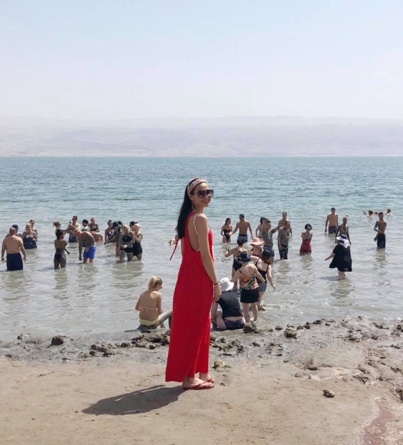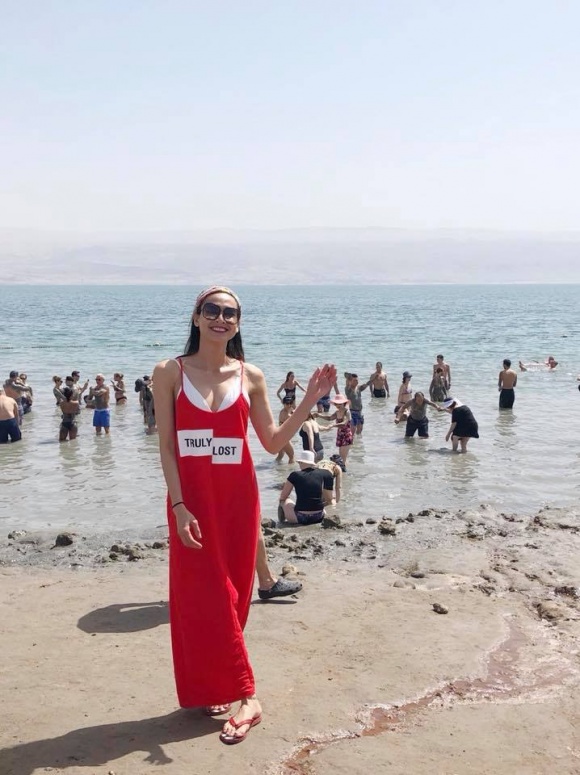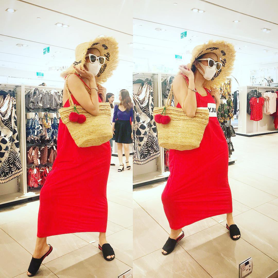 Dương Mỹ Linh ứng dựng chiếc đầm đỏ này trong một lần đi biển gần đây. Cô kết hợp với dép lê cùng tông, kính mát và khăn turban đỏm dáng.
