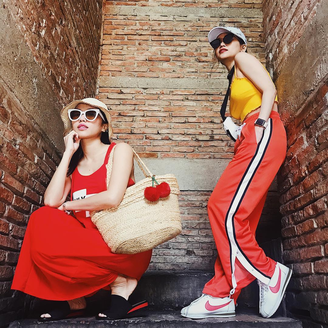 Cô phối chiếc đầm đỏ rực cùng chiếc giỏ, mũ cói xinh xắn. Đôi dép bệt màu đen viền đỏ cũng tam gọi là có chút đồng điệu với trang phục. Nhìn tổng thể, Diệu Nhi khá ổn với thời trang này.