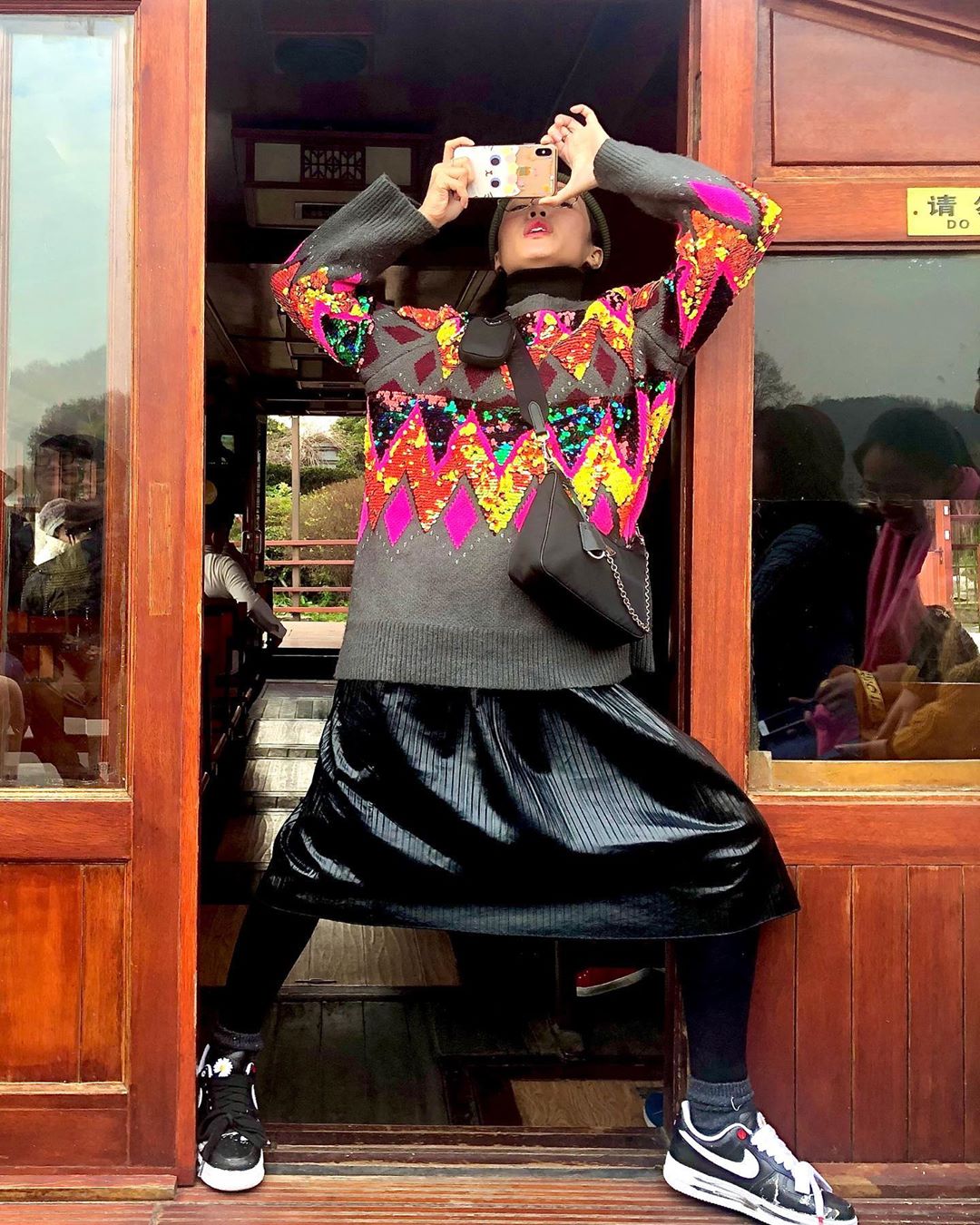 Phí Phương Anh lại tạo cho mình hình ảnh độc đáo với áo thun cổ lọ mix cùng chân váy xòe và túi Chanel mang dưới tay.