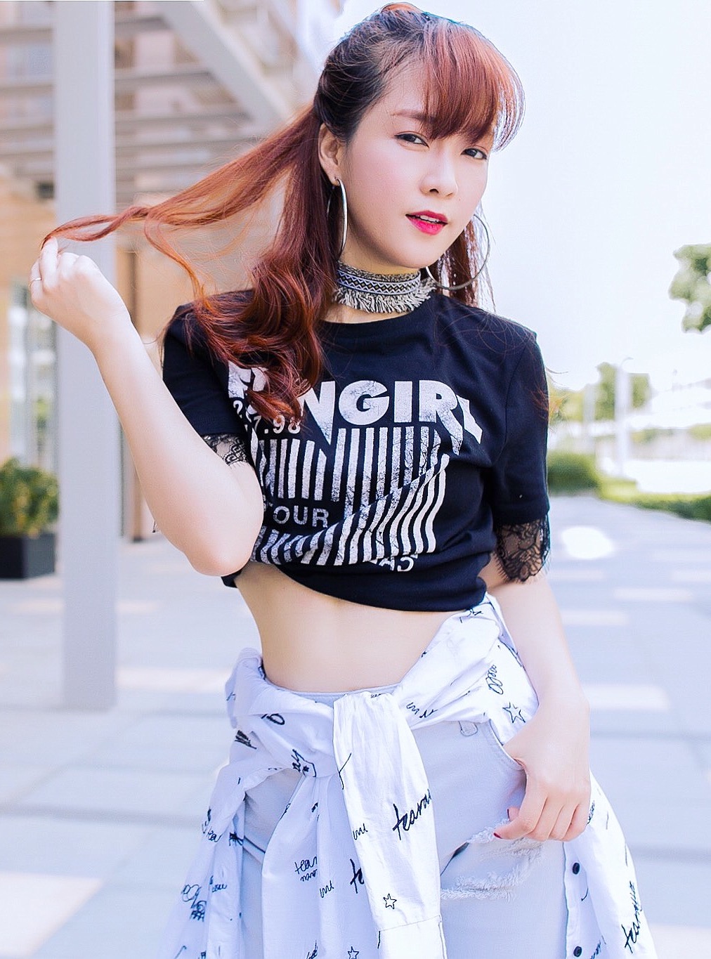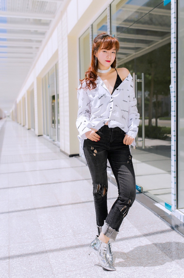 Trong bộ ảnh street style mới nhất, Đinh Hương xuất hiện với diện mạo trẻ trung, năng động. Combo sơmi trễ vai cùng quần jeans rách gối chưa bao giờ mất đi vị trí độc tôn trong tủ đồ của giới trẻ. Kết hợp cùng là đôi boots ton-sur-ton với phụ kiện chocker ánh kim nổi bật.
