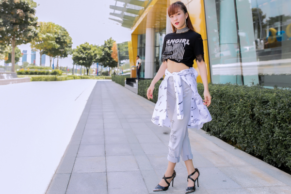 Trang phục thứ 2, áo sơmi một lần nữa được tận dụng bằng cách thắt hờ hững phần eo. Mẫu croptop đen cá tính giúp Đinh Hương khoe khéo vòng eo thon gọn. Bên cạnh đó, không thể không nhắc tới quần jeans in slogan - item đang là hot trend khiến các bạn trẻ lùng sục suốt thời gian qua.