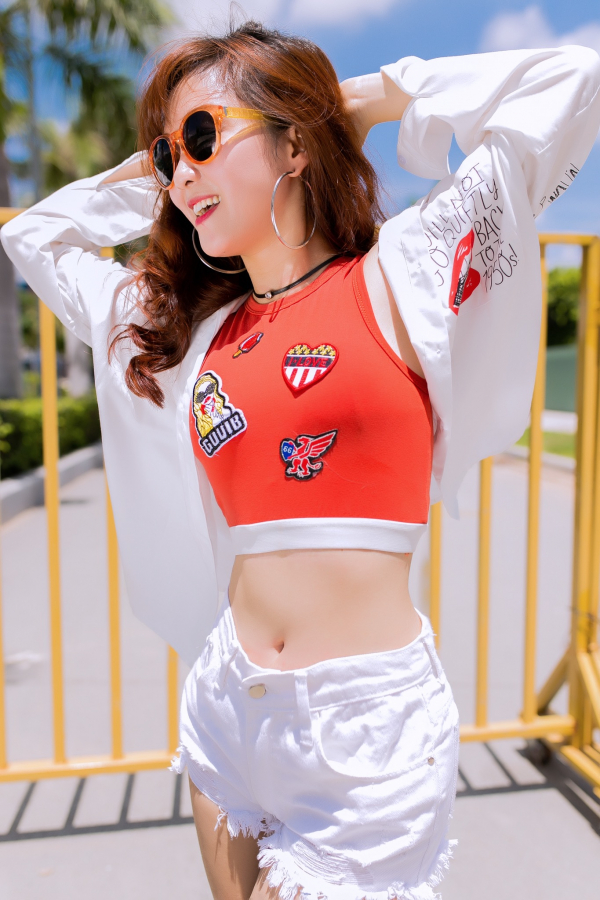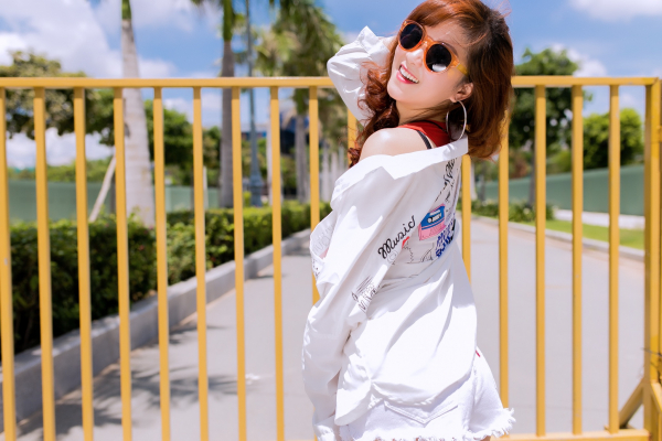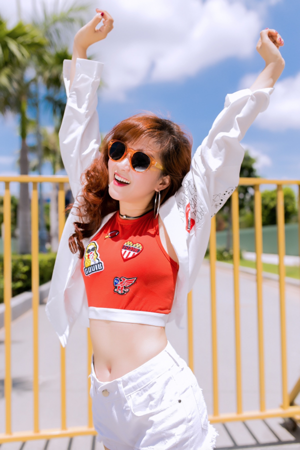 Không khí mùa hè được tô điểm mạnh mẽ hơn với sắc cam và đỏ nổi bật dưới ánh nắng. Thời tiết này, kính mắt chắc chắn là thứ phụ kiện bạn không thể bỏ qua, vừa giúp bảo vệ “cửa sổ tâm hồn”, vừa khiến bạn trở nên thời trang và hiện đại hơn. Cùng với đó, crop-top hay jeans cạp cao cũng là trang phục chiếm phần lớn trong tủ đồ mùa nóng của Đinh Hương.