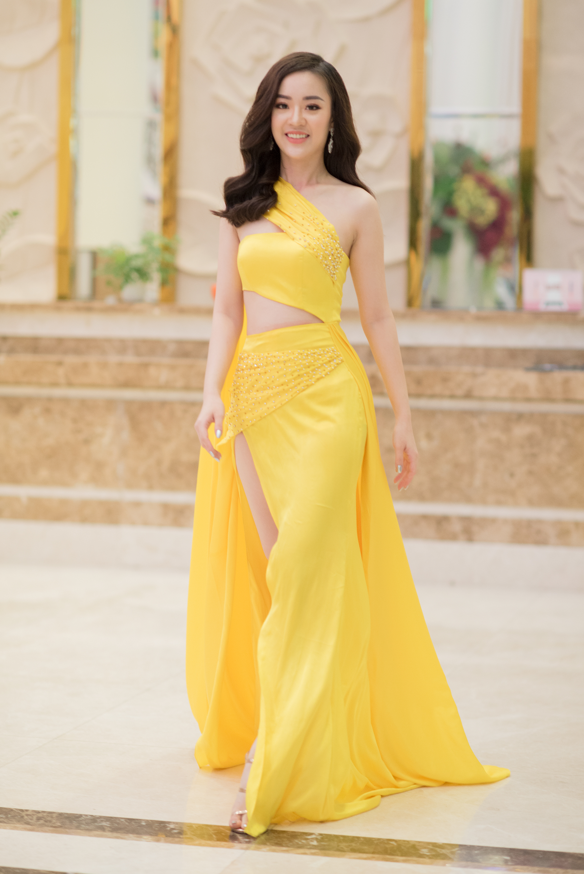 Xuất hiện trên hàng ghế giám khảo một cuộc thi dành cho các người mẫu nhí, Hoàng Hải Thu trở thành tâm điểm với ngoại hình xinh đẹp cùng chiều cao nổi bật. Cô nàng chọn cho mình thiết kế màu vàng chanh mềm mại đầy tính thời trang và sành điệu. Chi tiết xẻ đùi cao hút mắt cùng với những khoảng cắt hở táo bạo nơi eo, ngực, vai khiến cho Hoàng Hải Thu có phần e dè khi di chuyển để tránh sự cố lộ hàng.