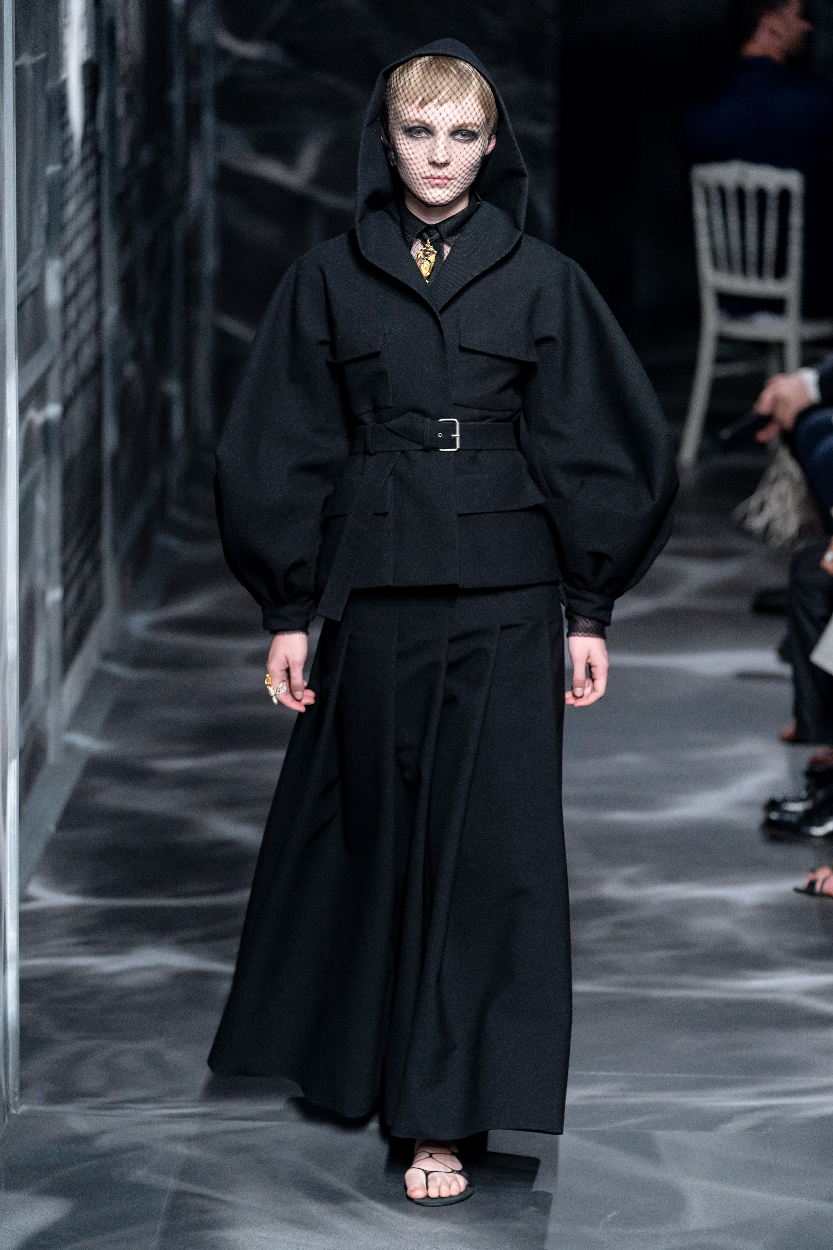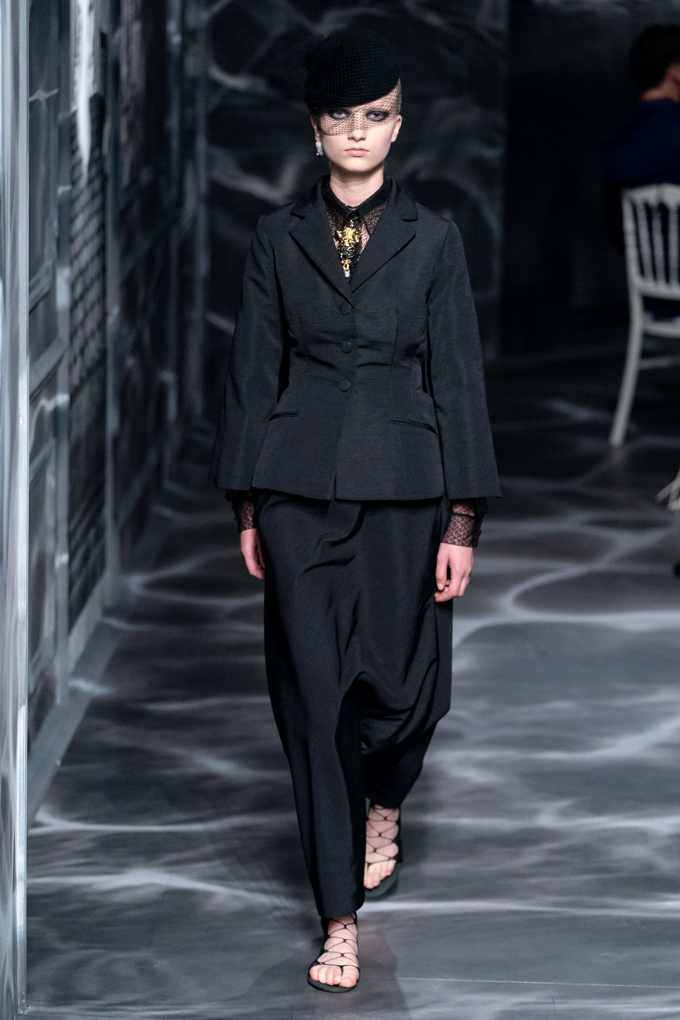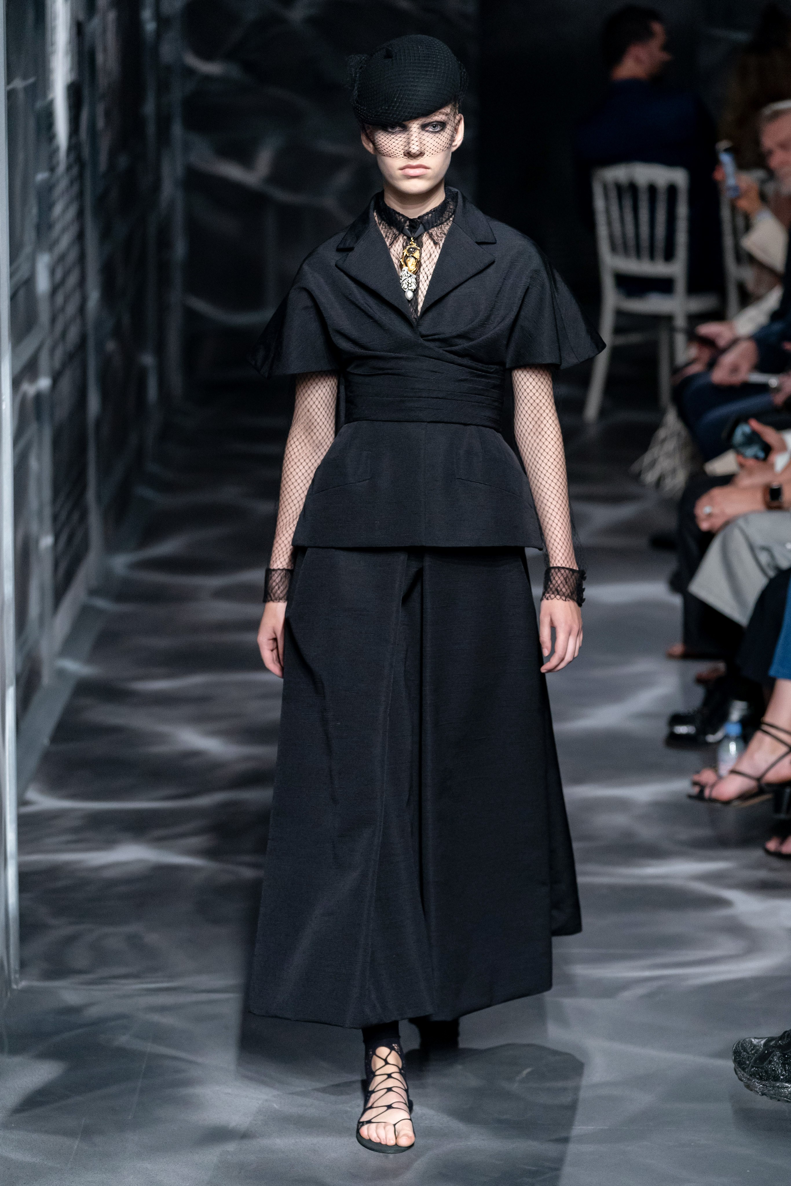 Những người mẫu xuất hiện trong trang phục đen, bước đi ngạo nghễ với sàn catwalk tái hiện không gian một ngôi nhà cũ kỹ, gần như bỏ hoang đã cho thấy ý niệm táo bạo của Dior. Loạt váy phồng to bản, phần eo thít chặt tôn dáng người phụ nữ là các sáng tạo được trình làng.