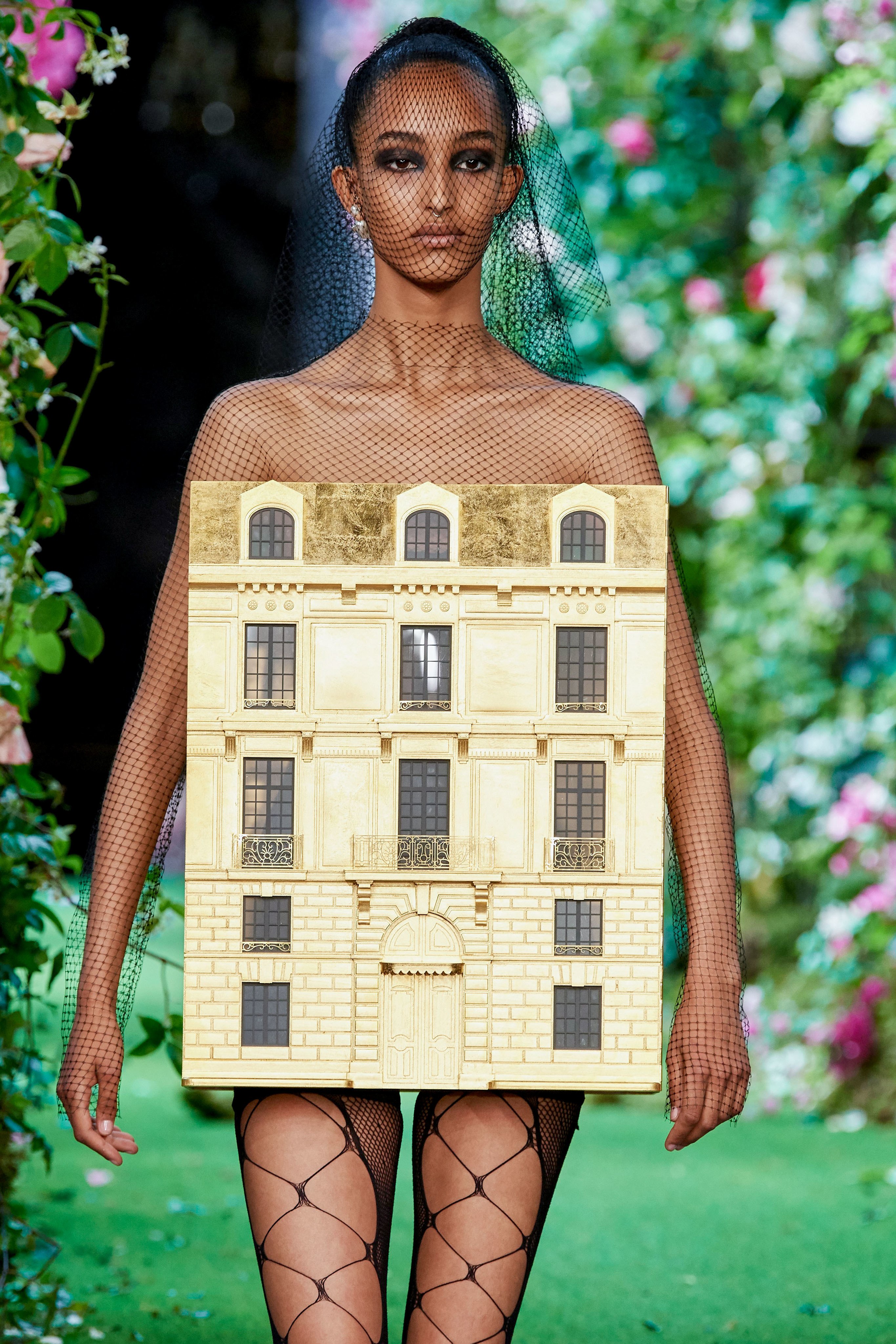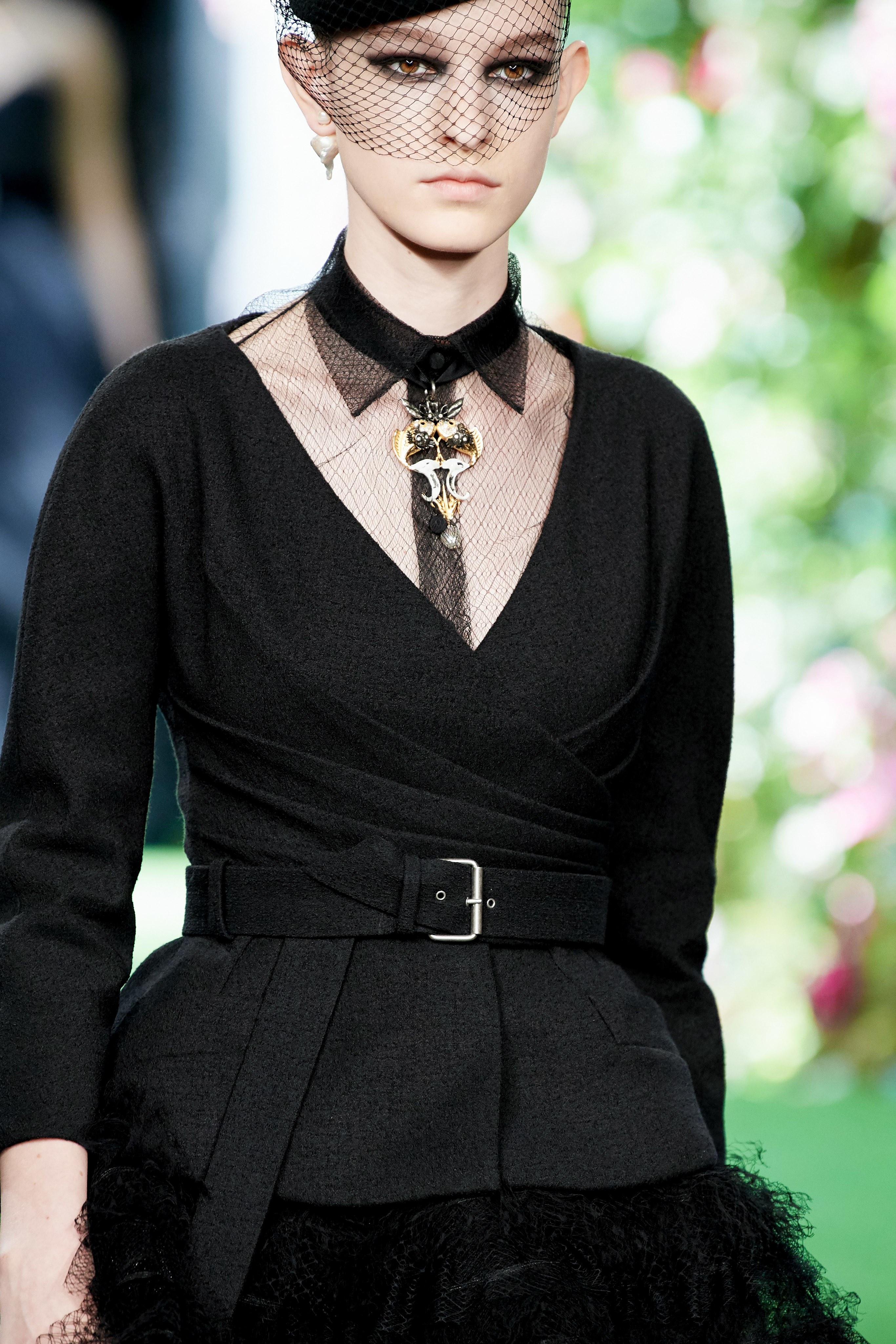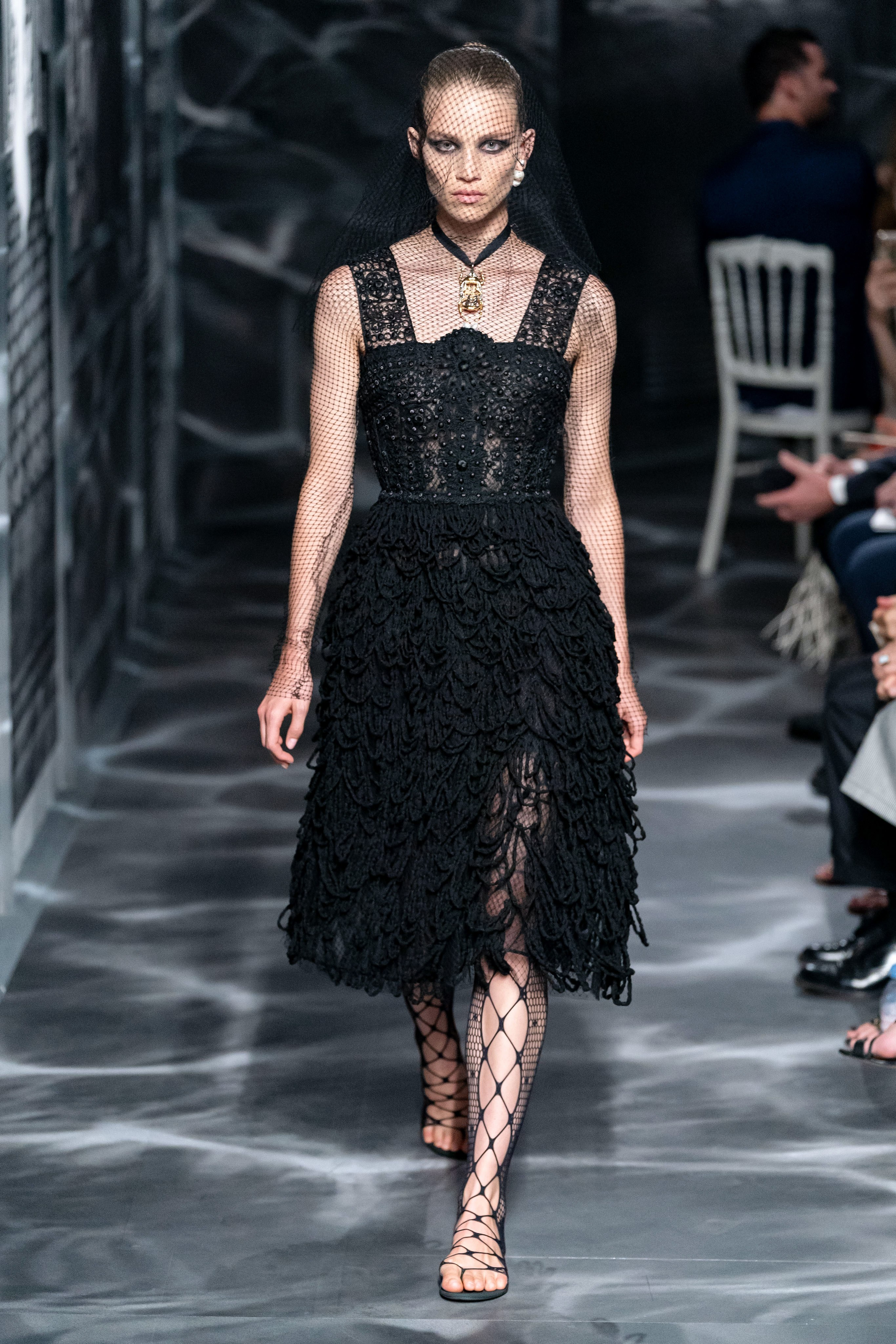 Những người mẫu xuất hiện trong trang phục đen, bước đi ngạo nghễ với sàn catwalk tái hiện không gian một ngôi nhà cũ kỹ, gần như bỏ hoang đã cho thấy ý niệm táo bạo của Dior. Loạt váy phồng to bản, phần eo thít chặt tôn dáng người phụ nữ là các sáng tạo được trình làng.