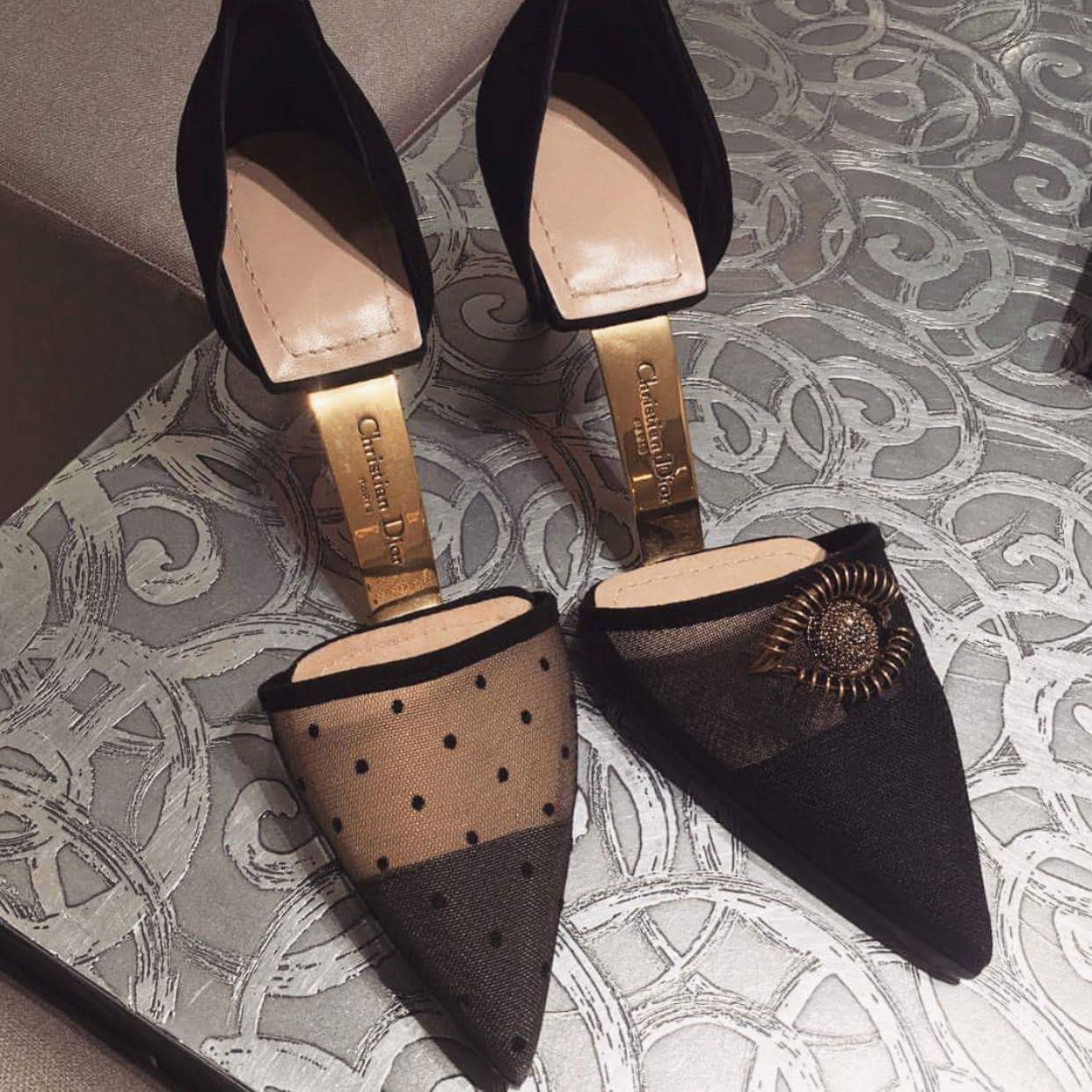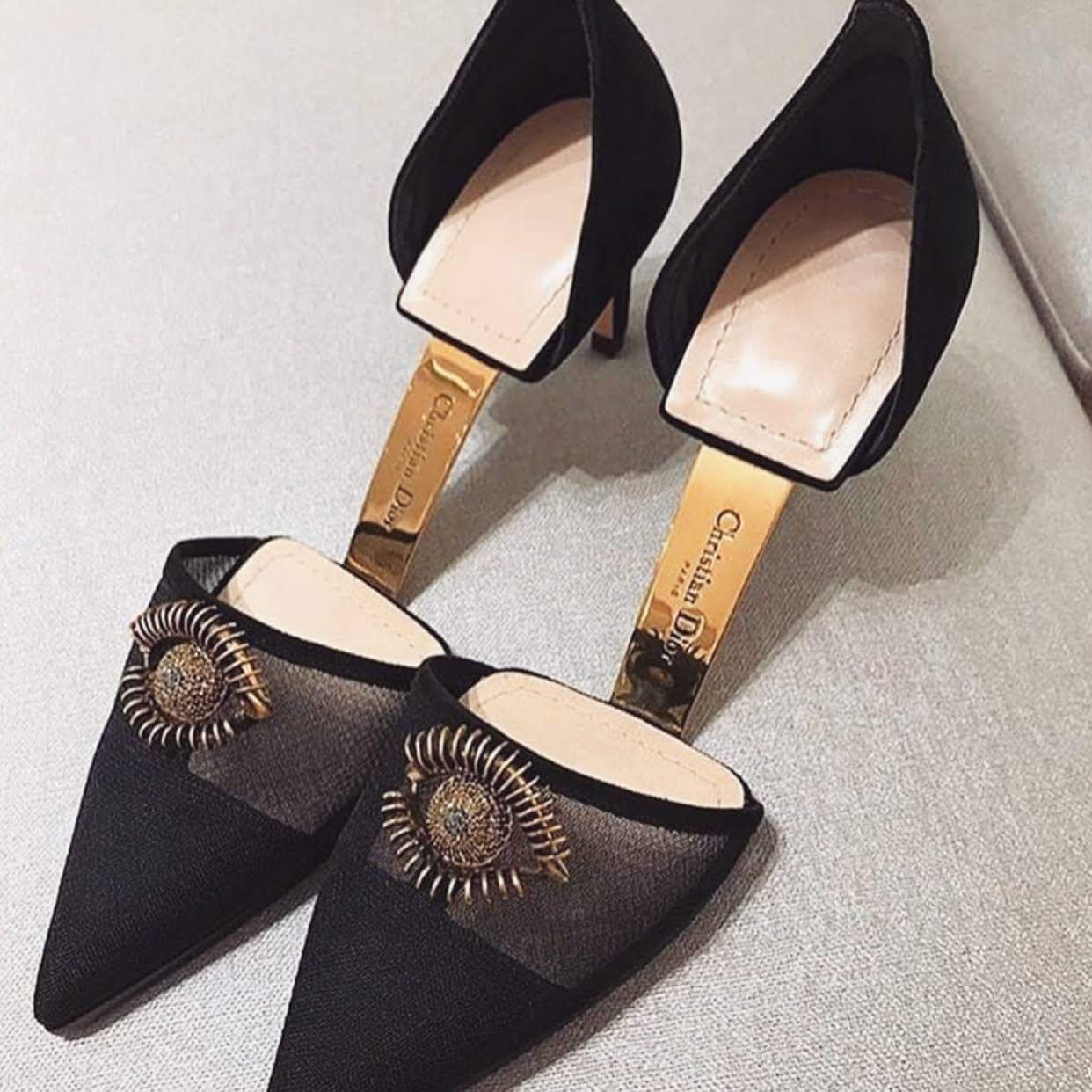 Thay vì phần đế liền thành một mảnh, mẫu giày mới của Dior rất sáng tạo khi cắt làm đôi. Phần mũi và gót dính với nhau bằng tấm kim loại, chạm khắc tên Christian Dior sang chảnh.