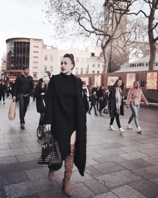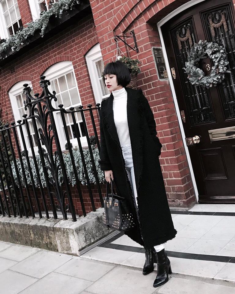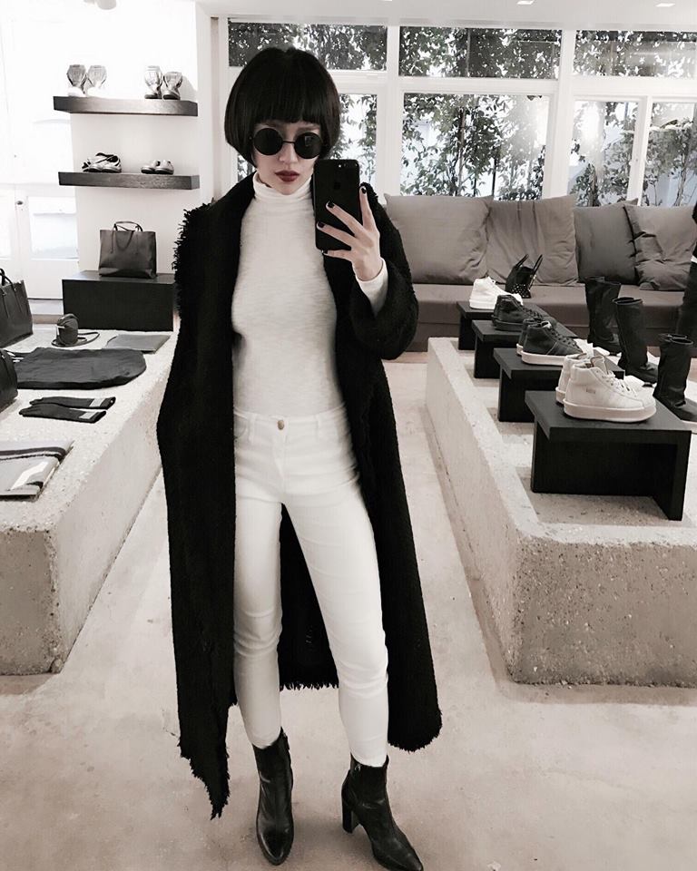 Các bạn gái chắc chắn không nên bỏ qua cách diện đồ như Tít nếu muốn sở hữu phong cách cực trendy mà vẫn giữ ấm được cơ thể nhé! Với những trang phục đen toàn tập từ trong ra ngoài như thế này, hãy tạo điểm nhấn bằng cách diện ngay đôi boots da cao trên đầu gối màu nâu.