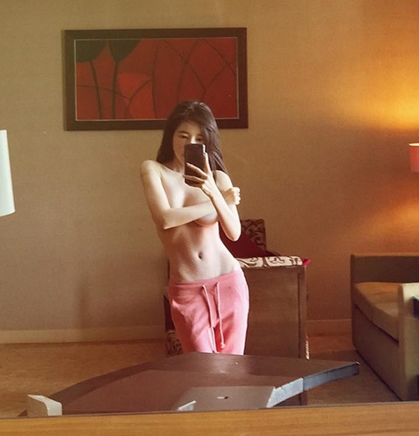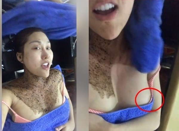 Chiếc áo ngủ rất rộng, nhưng không che đi được vòng 1 của Angela Phương Trinh. Có thể thấy rõ cặp nhũ hoa rõ mồn một sau lớp áo của cô nàng.