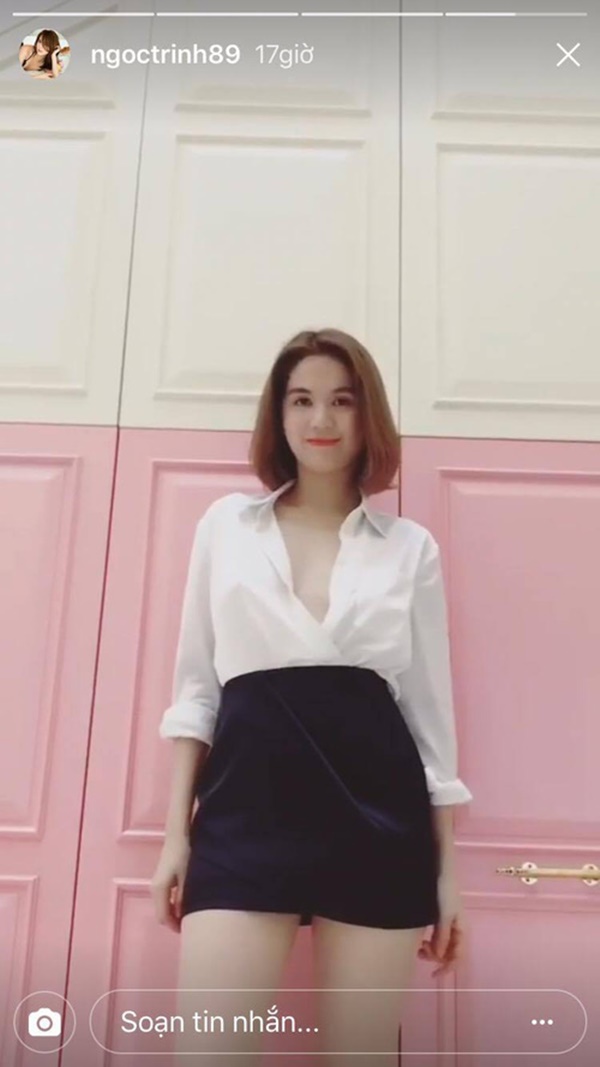 Sơ mi trắng, chân váy công sở, trông Ngọc Trinh rất thanh lịch. Nhưng nhìn kỹ mà xem, bạn sẽ thấy điều gì bất thường.