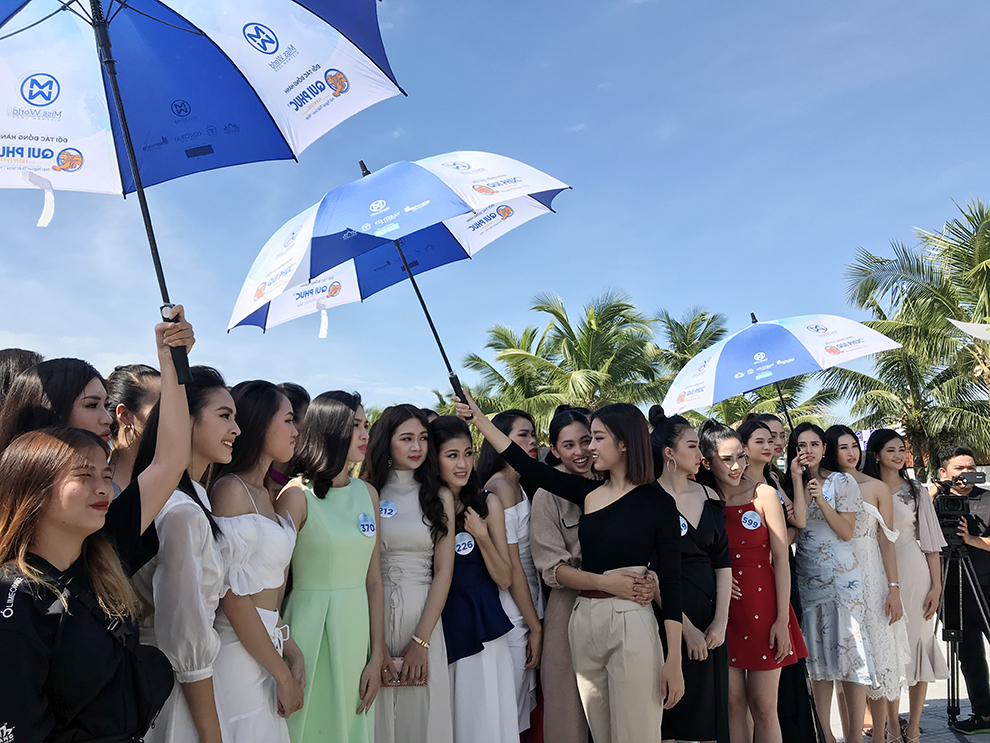 Tiểu Vy ôm eo Mỹ Linh, Mỹ Linh che ô cho các thí sinh