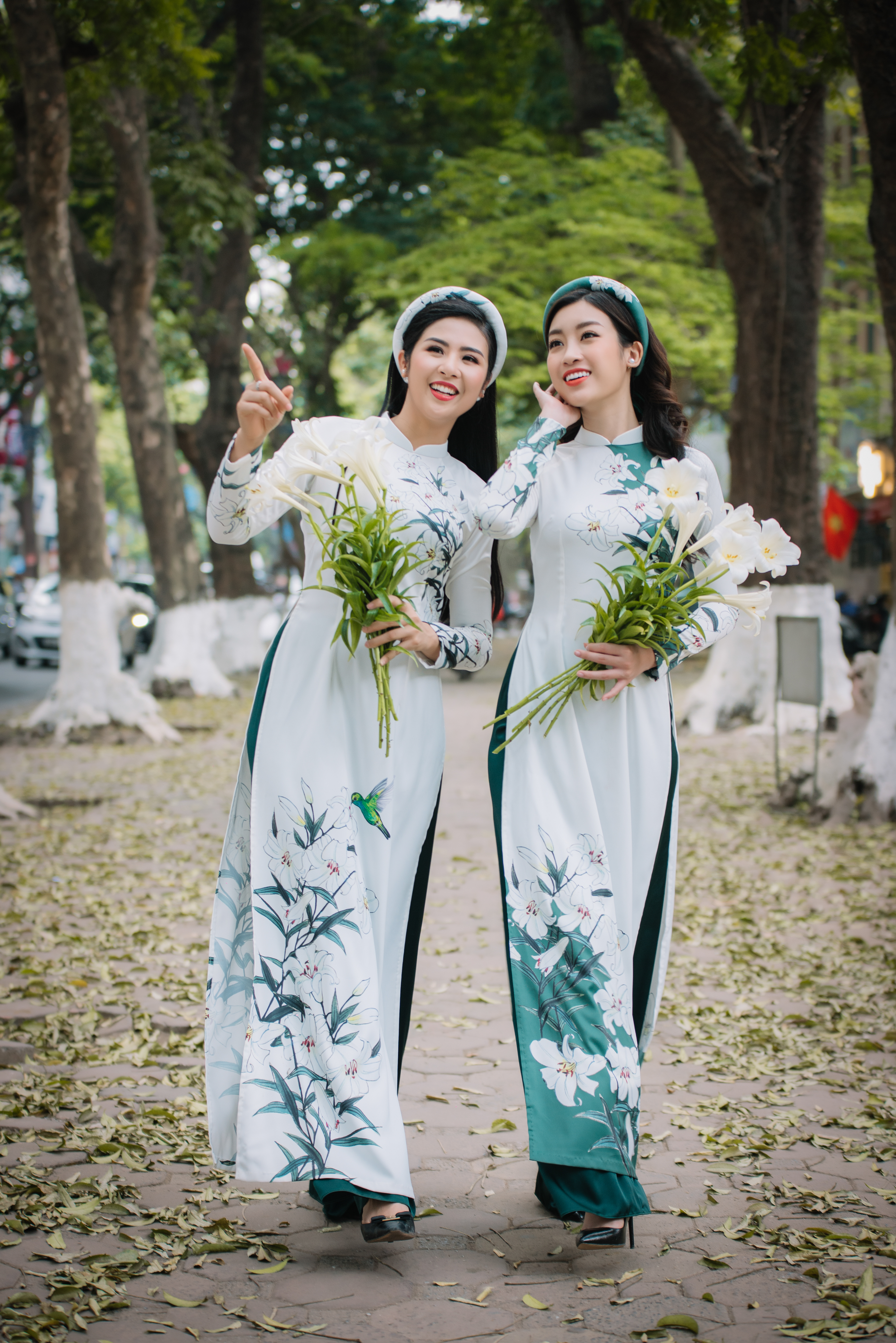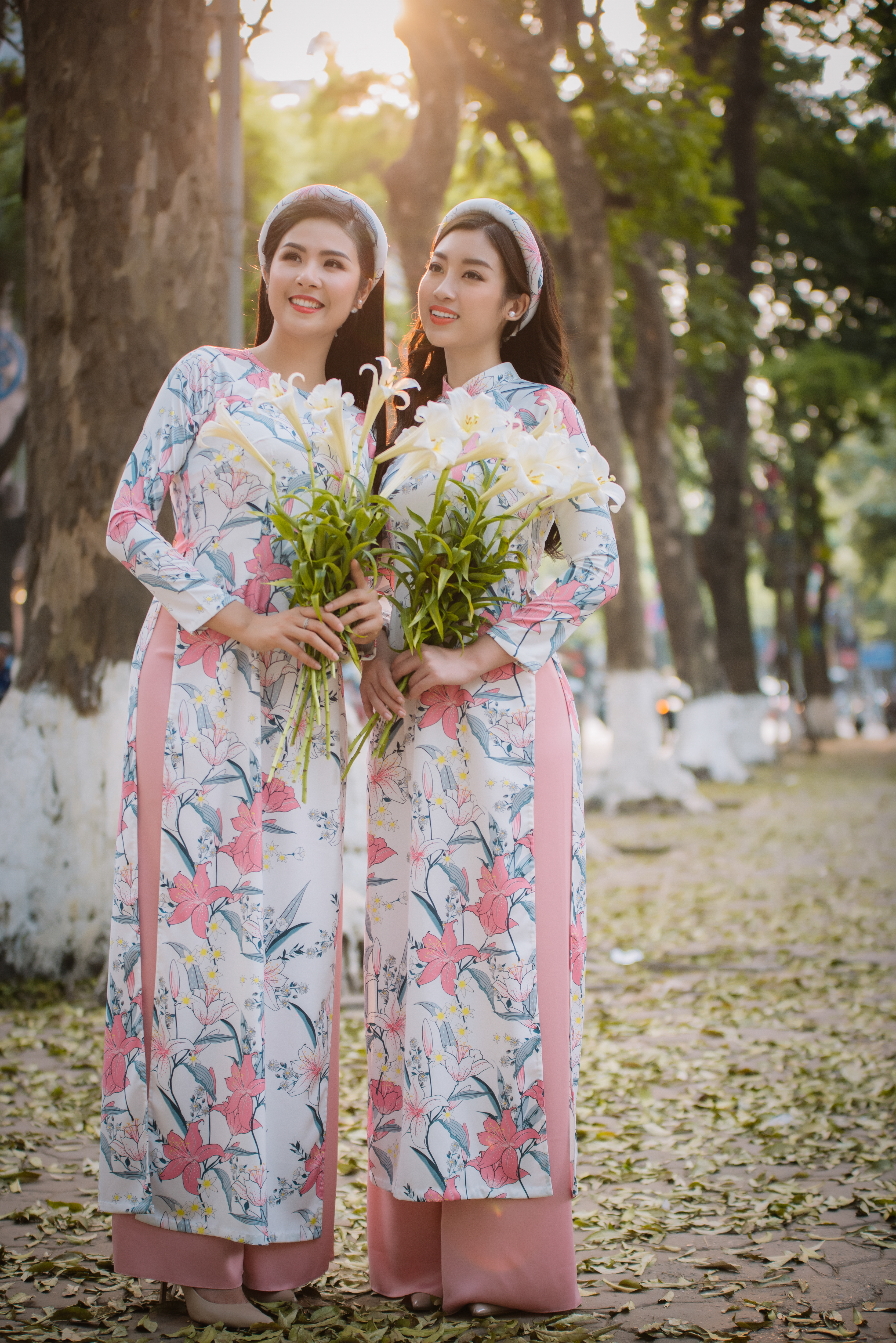 Trước ống kính, Ngọc Hân và Đỗ Mỹ Linh đã diện những thiết kế áo dài hoạ tiết hoa loa kèn dạo bước trên đường phố Hà Nội. Cả hai nàng Hậu đều trang điểm nhẹ nhàng, khoe nụ cười toả nắng khi sóng bước bên nhau.