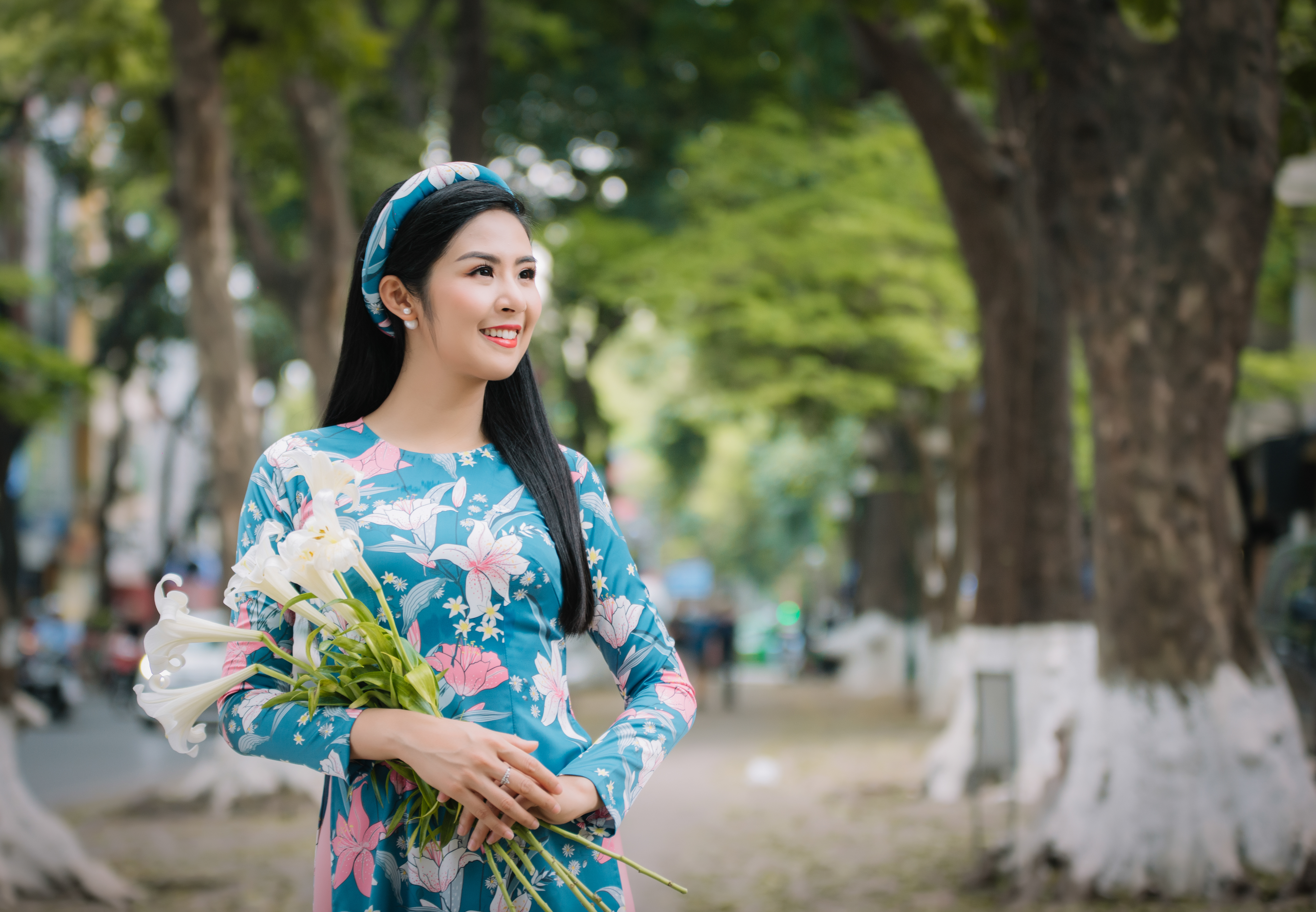 Bộ sưu tập vẫn trung thành với phom dáng truyền thống của áo dài dân tộc nhưng mang hơi thở của thời đại nhờ kỹ thuật cắt may và công nghệ in màu. Hoạ tiết hoa loa kèn được in bay bổng trên nền vải lụa, gấm hoa phù hợp để các bạn gái mặc đi dạo phố hoặc khi tham gia các buổi tiệc, chương trình mang đậm nét văn hoá truyền thống.