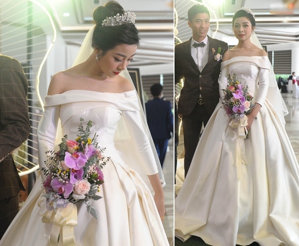 Trong khi nhiều cô dâu nổi tiếng chọn những thiết kế váy cổ tích bồng bềnh với những chi tiết đắt giá xa xỉ, thì váy cưới của Viên Minh tối giản tất cả nhưng vẫn đẹp đến lịm tim. Phần vai váy được làm từ vải xếp nếp, tạo thành một chiếc nơ lớn ở phía sau làm điểm nhấn. Để giữ phong cách thanh lịch, Viên Minh hạn chế trang sức, không cài khăn voan. Kiểu đầm như bà xã Công Phượng có giá thuê chỉ khoảng 35 triệu đồng.
