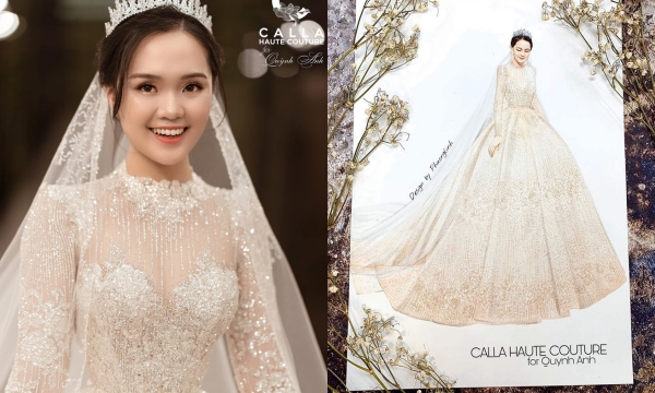 Bản phác thảo váy cưới của bà xã Duy Mạnh khiến dân tình xuýt xoa vì quá đẹp. Đây là tác phẩm Haute Couture được Phương Linh dồn tâm huyết thực hiện, biến Quỳnh Anh thành cô dâu đẹp nhất trong lễ kết hôn.