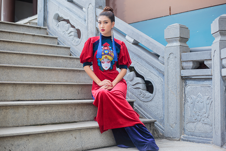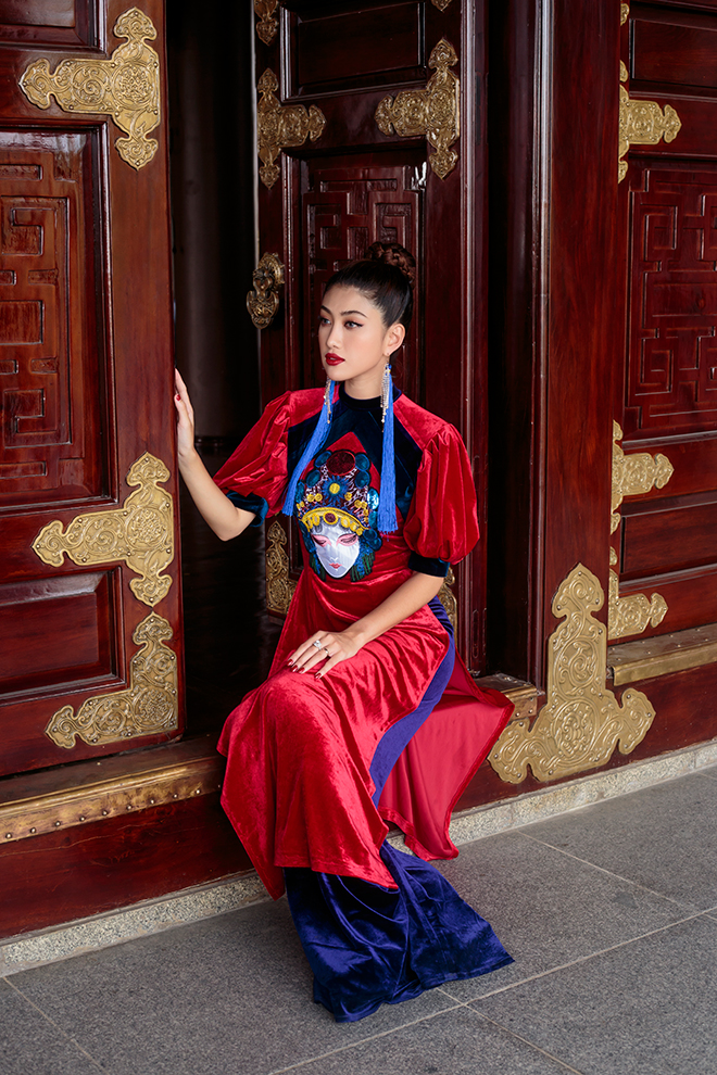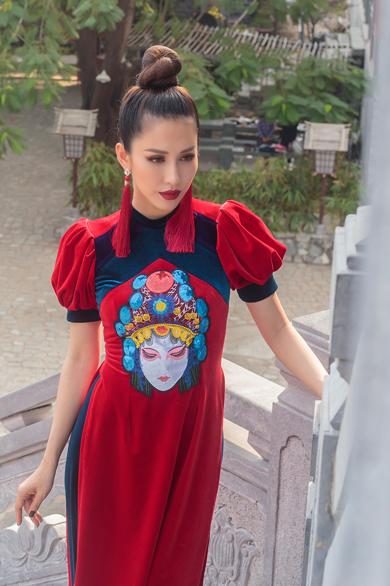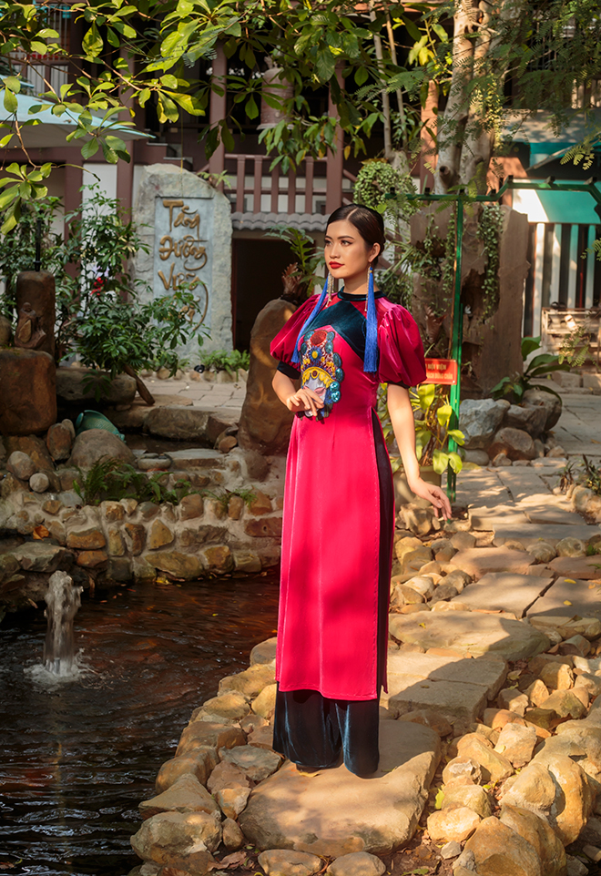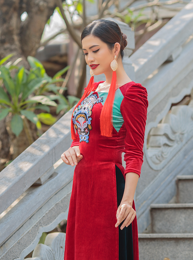 Áo dài nhung đỏ thêu họa tiết lấy cảm hứng từ nghệ thuật Tuồng đặc sắc