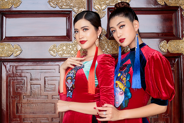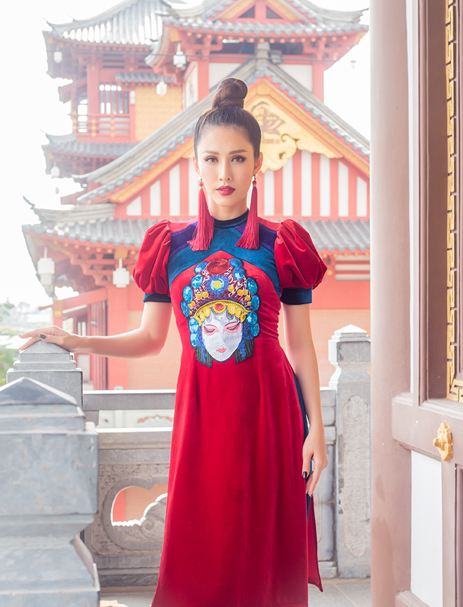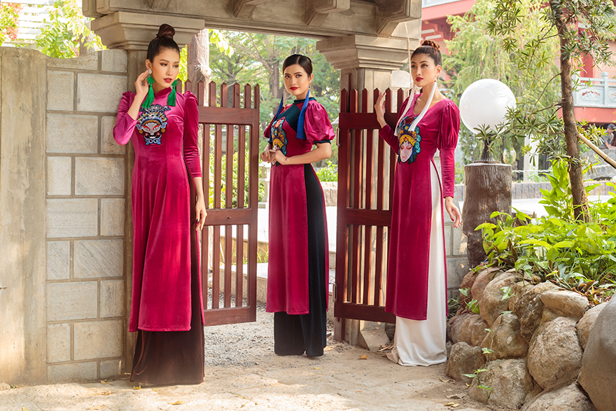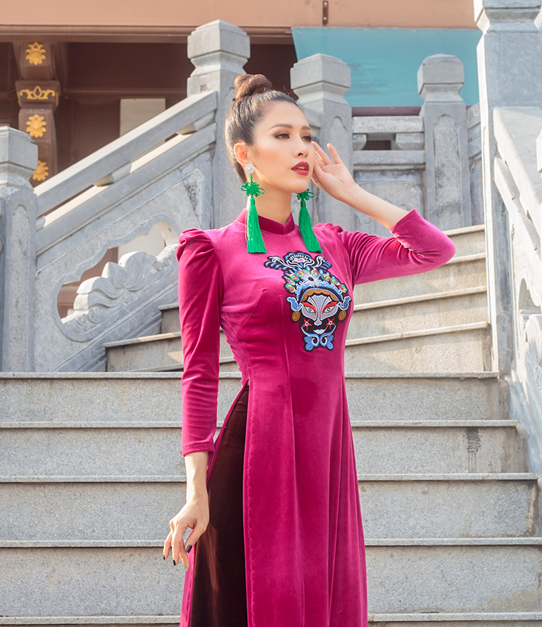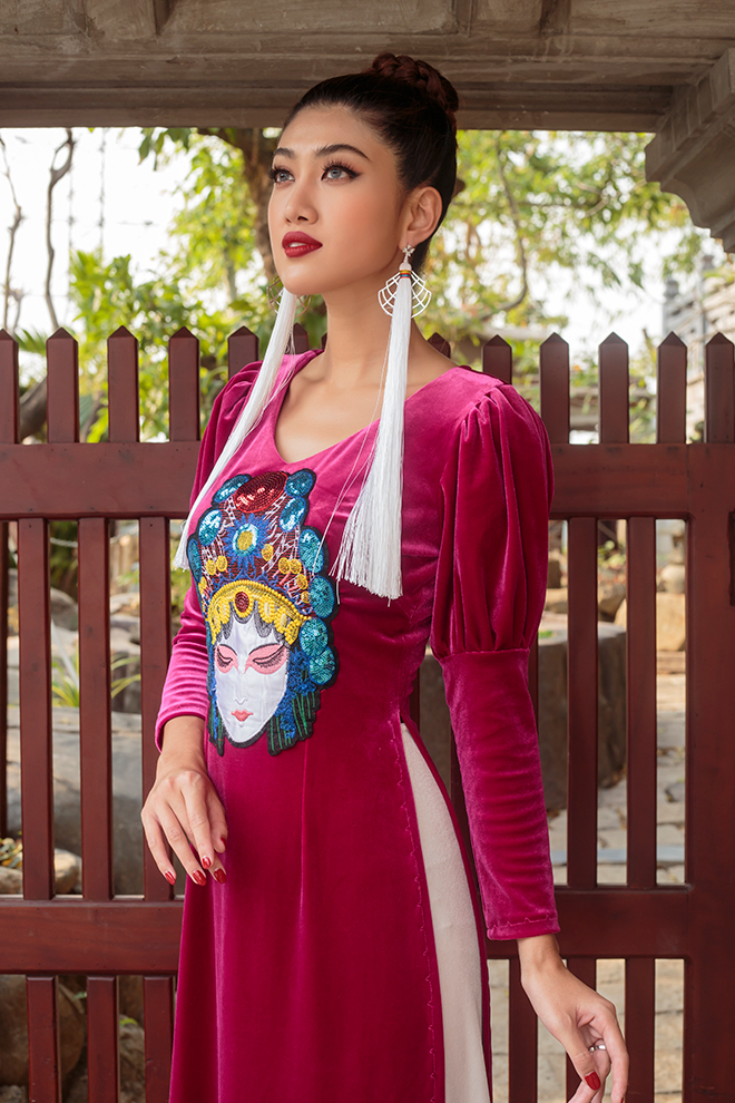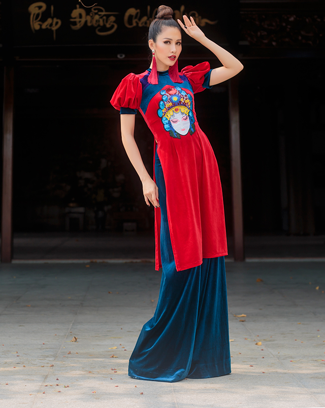 Áo dài nhung đỏ thêu họa tiết lấy cảm hứng từ nghệ thuật Tuồng đặc sắc