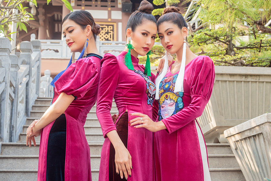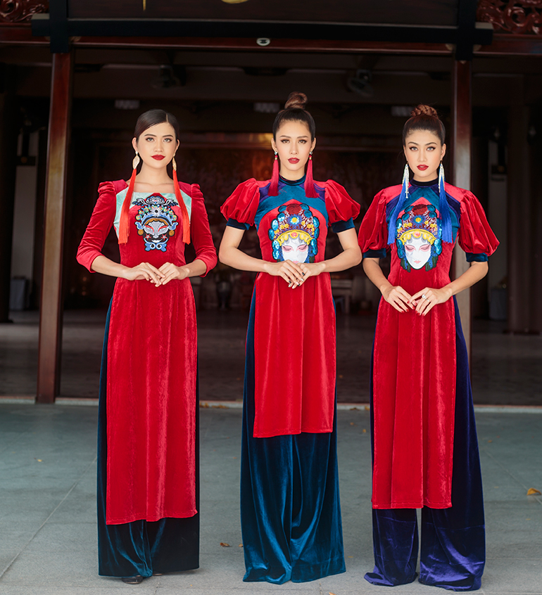 Trong BST “Dáng Việt muôn nơi”, hai cha con NTK đã lấy ý tưởng từ bộ môn nghệ thuật Tuồng xuất sứ từ Bình Định Trung Trung Bộ. Đây là một loại hình nghệ thuật được gìn giữ qua các thế kỷ đến nay được NTK đưa lên tà áo dài Việt làm mới lạ và sinh động hơn bao giờ hết.