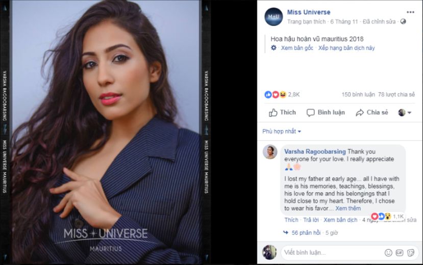 Ngay sau khi bị chê vì mặc chiếc áo chẳng hề nữ tính cô đã có dòng chia sẻ trong bài viết trên trang facebook Miss Universe khiến nhiều người xúc động: “Tôi mất cha từ khi còn nhỏ. Tất cả những gì tôi có về ông là những kỷ niệm, lời dạy bảo, sự chúc phúc, tình yêu của ông dành cho tôi cũng như những kỷ vật mà tôi rất trân trọng.