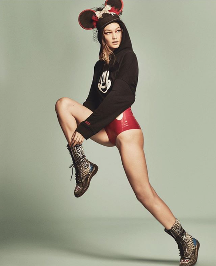Gigi khoe vẻ đẹp khỏe khoắn với đôi chân thon dài với nguyên bộ đồ hình Mickey Mouse