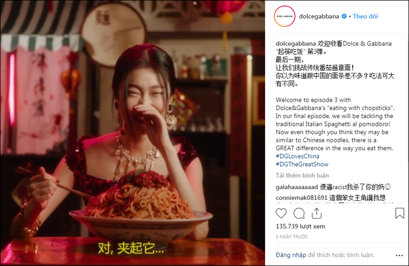 Trước khi show diễn của thương hiệu đình đám này diễn ra tại Thượng Hải. Theo đó, trong các video quảng bá, D&G đã sử dụng câu chuyện dùng đũa - một công cụ dùng bữa truyền thống của người Trung Quốc và nhiều quốc gia tại châu Á. Người mẫu xuất hiện trong các thiết kế mới của D&G và được trải nghiệm những món ăn như pizza, taco, spaghetti (mì Ý) bằng đũa.
