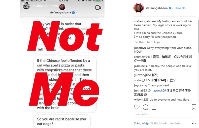 Sau đó, nhà thiết kế này đăng trên trang cá nhân rằng tài khoản của mình đã bị hack. “Chúng tôi xin lỗi vì sự việc đang gây ảnh hưởng đến người dân Trung Quốc. Chúng tôi luôn yêu quý và tôn trọng văn hóa Trung Hoa”, Weibo Dolce & Gabbana chia sẻ.
