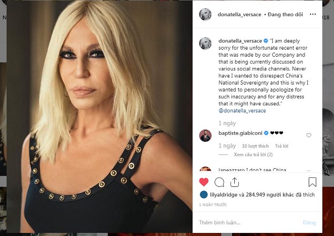 Không lâu sau NTK kiêm giám đốc sáng tạo Donatella Versace đã lên tiếng xin lỗi đến người dân Trung Quốc trên trang cá nhân.