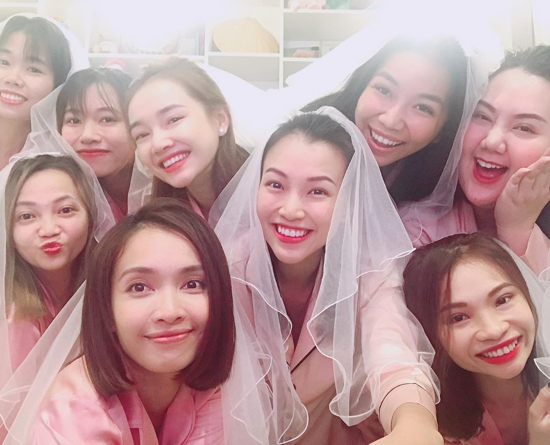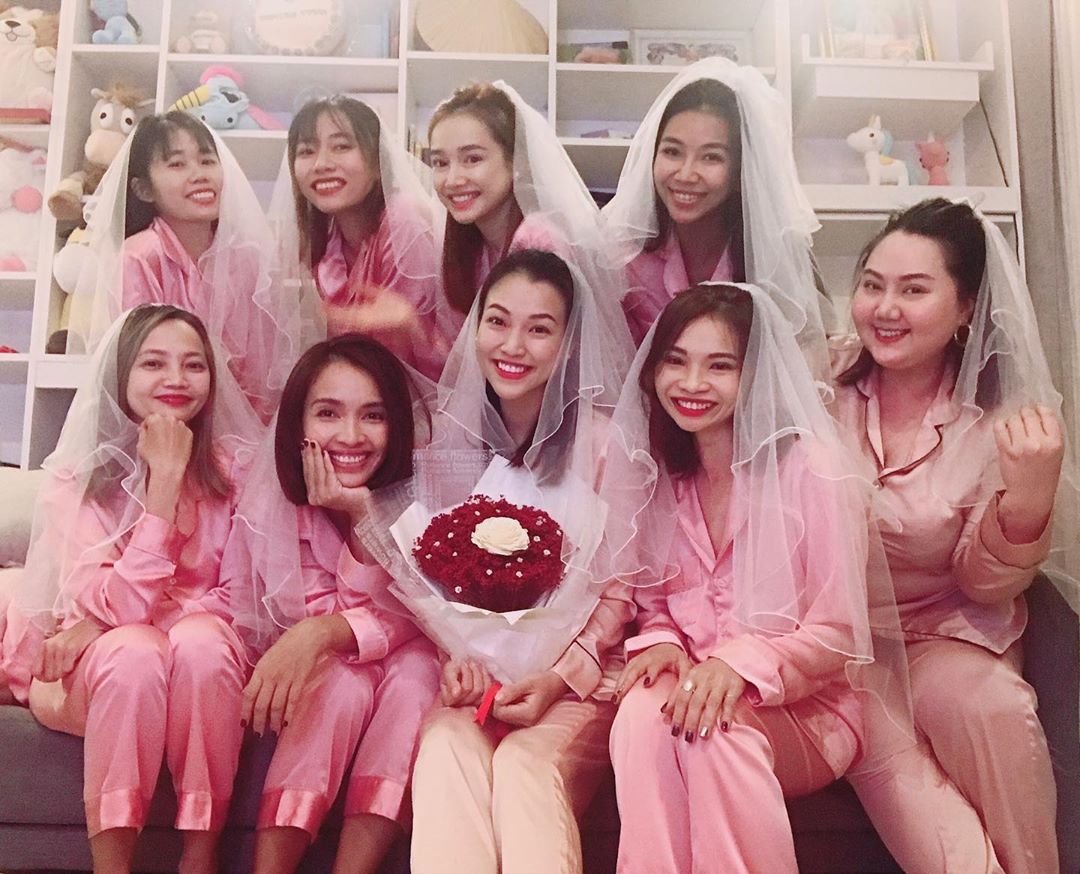 Có được hội bạn thân với những nghệ sĩ xinh đẹp, luôn bên cạnh như Hoàng Oanh quả là điều may mắn. Mọi người đã cùng nhau tổ chức một buổi tiệc độc thân cho cô nàng, với đồng phục là pijama hồng ấn tượng.