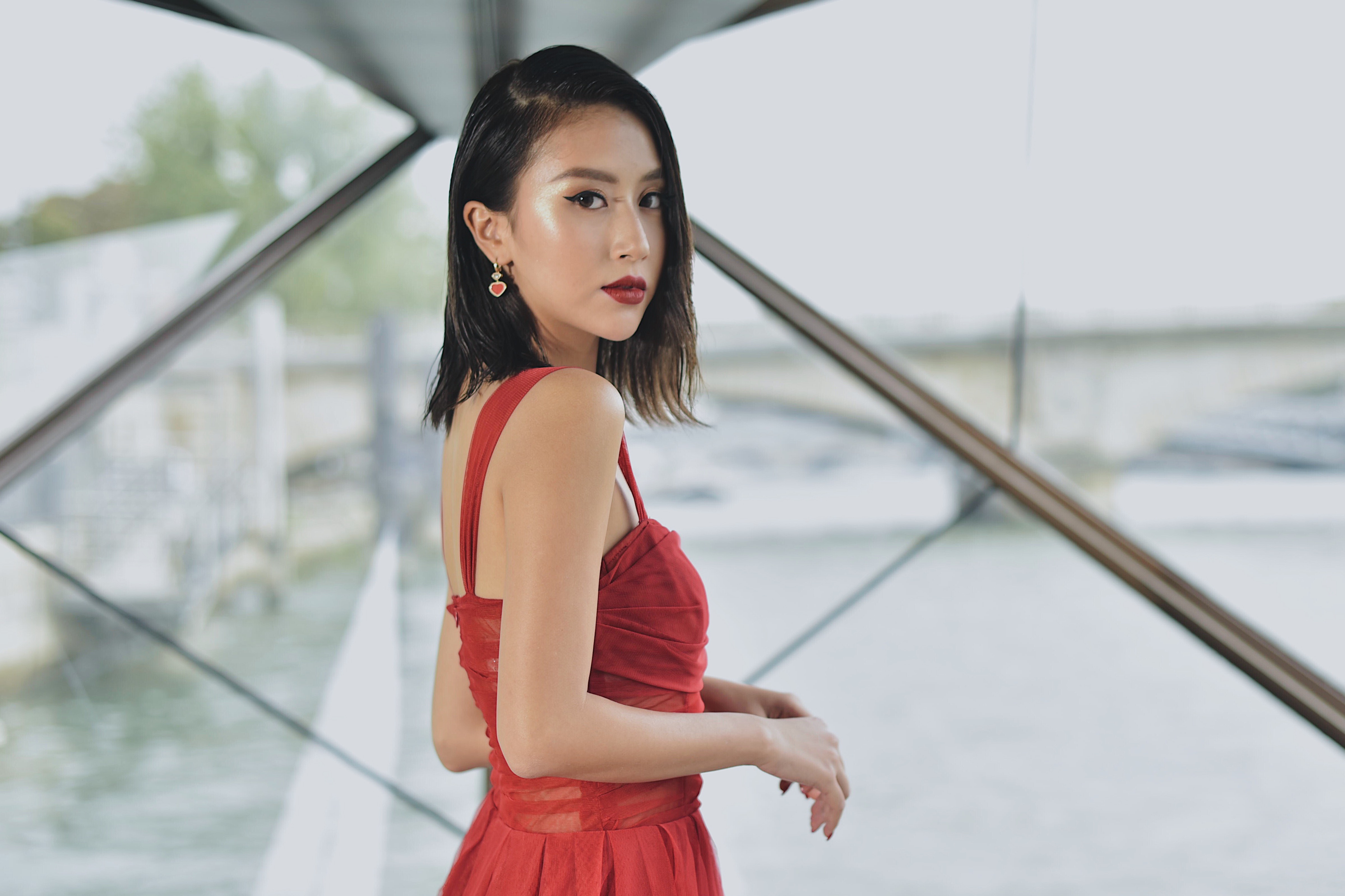 Chiếc đầm màu đỏ gạch với thiết kế pha lẫn giữa hiện đại và cổ điển với những khoảng hở “lấp ló” ý nhị sau các nếp gấp vải khiến Quỳnh Anh Shyn quyến rũ bội phần.