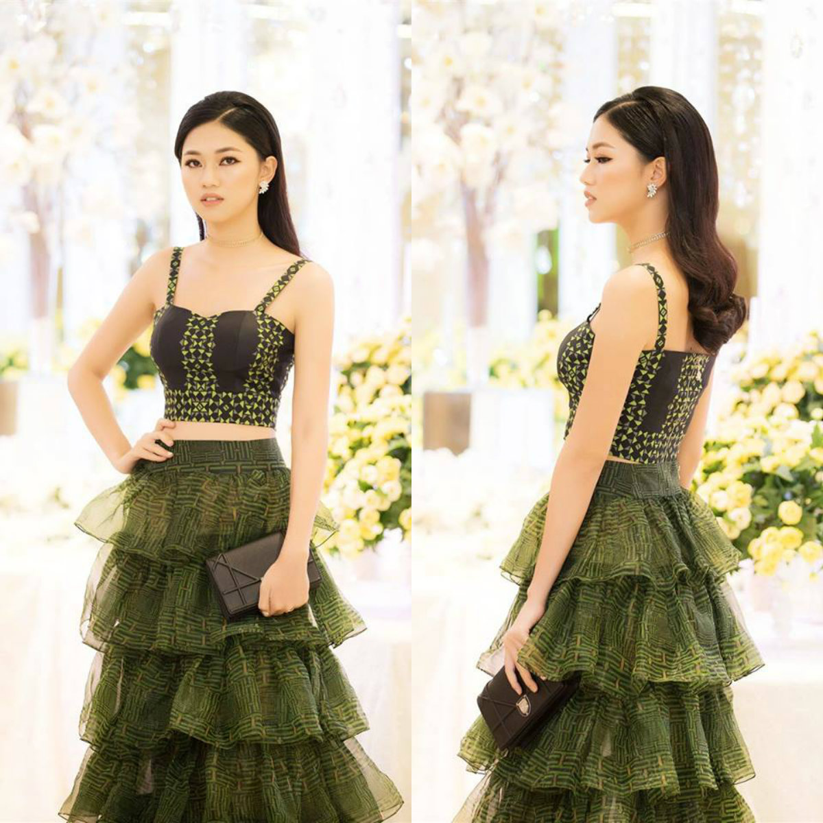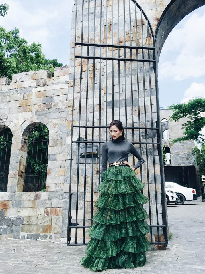 Dường như thiết kế váy xếp tầng bèo nhún rất được lòng sao Việt. Sau đó Á hậu Thanh Tú cũng chọn mẫu váy này cùng cách mix đồ cùng áo crop-top xuất hiện tại một sự kiện thời trang ở Hà Nội.