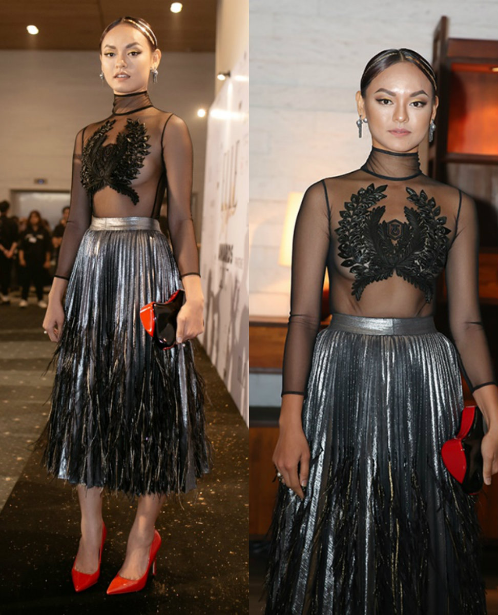 Sang năm 2017 được Mai Ngô diện lại tại sự kiện thời trang. Người đẹp The Face che chắn duy nhất vùng ngực phía trước, phía dưới kết hợp cùng chân váy xòe. Tuy vậy, đôi giày màu đỏ được cho là không ăn khớp với set đồ gợi cảm. Có lẽ, chủ đích của cô nàng là để xuyệt tông với chiếc túi xách trên tay.